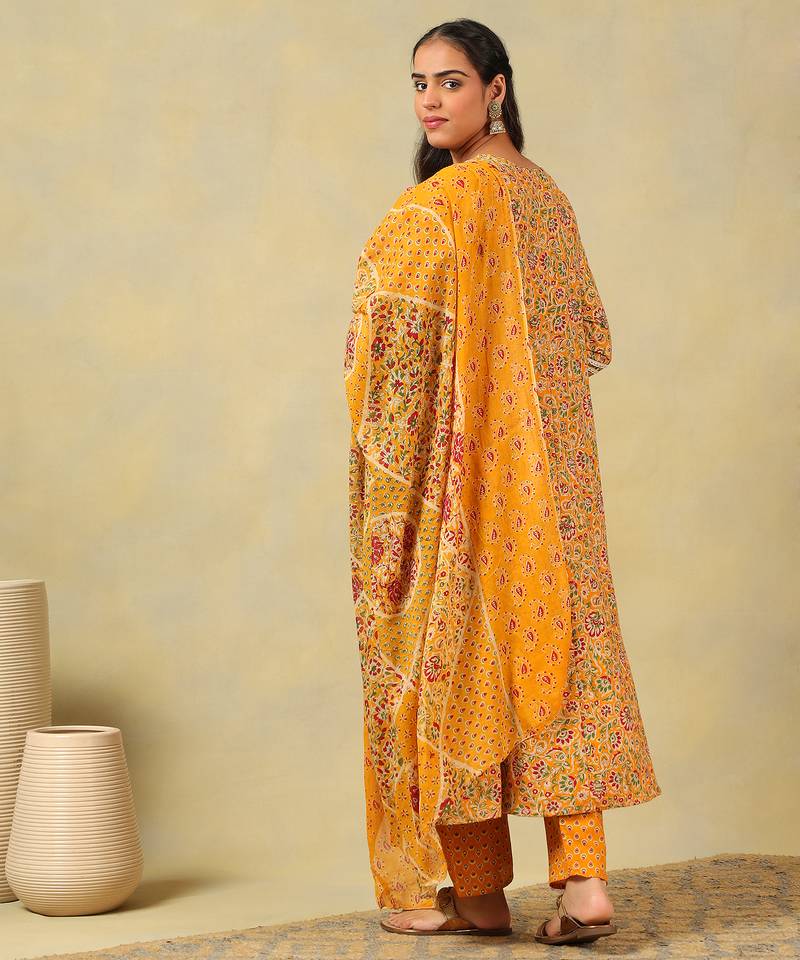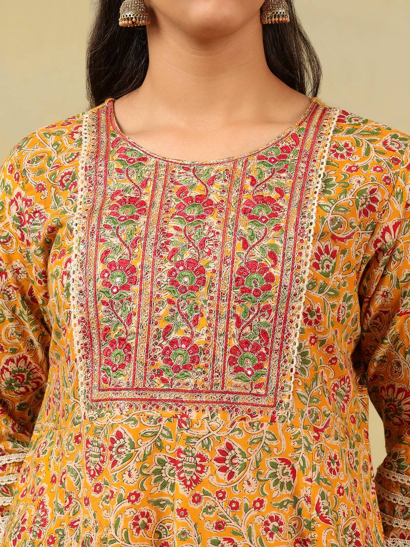 | Product Description | Step Into Artisanal Grace With The Amara Set, Featuring An Intricate Mustard Floral Bloom Print Usp. This Flared Anarkali Silhouette Is Richly Adorned With Small, Multi Colored Botanical Motifs In Shades Of Red And Green Against A Warm Mustard Yellow Base. The Ensemble Is Highlighted By A Heavily Embroidered Rectangular Yoke And Finished With Delicate White Lace Borders On The Hem And Sleeves, Paired With Coordinating Printed Trousers And A Matching Dupatta For A Complete And Refined Festive Look. |