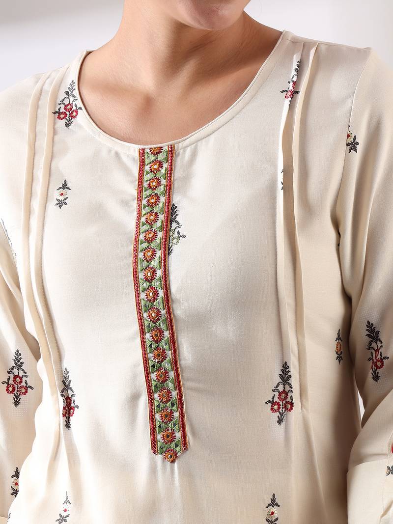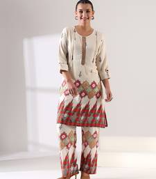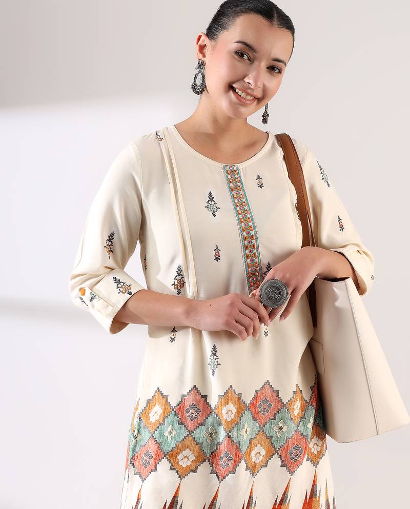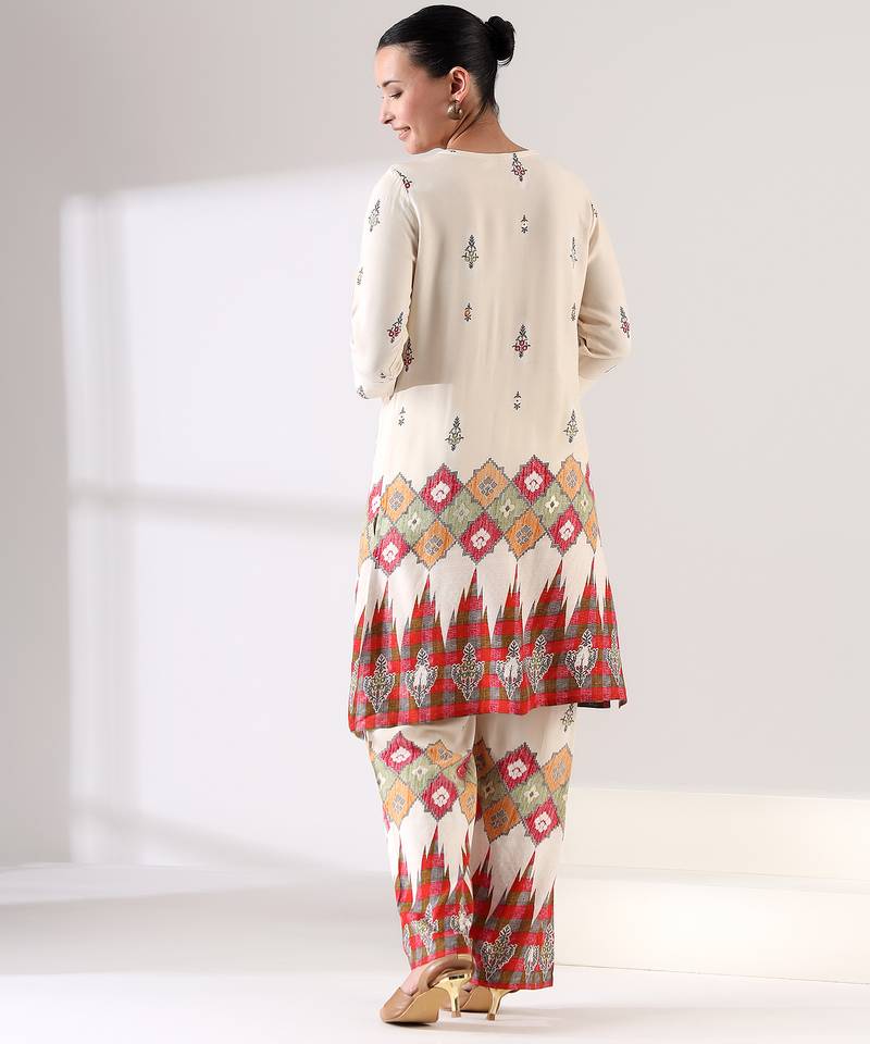 | Product Description | A Sophisticated Take On The Classic White Set, Featuring Earthy Terracotta And Teal Geometric Patterns. This 2 Piece Ensemble Stands Out With Its Intricate Mirror Work Embroidery And A Structured Diamond Motif Border At The Base Of The Tunic And Pants. The Breathable Fabric And Relaxed Wide Leg Fit Make It A Versatile Staple For The Modern Indian Wardrobe. |