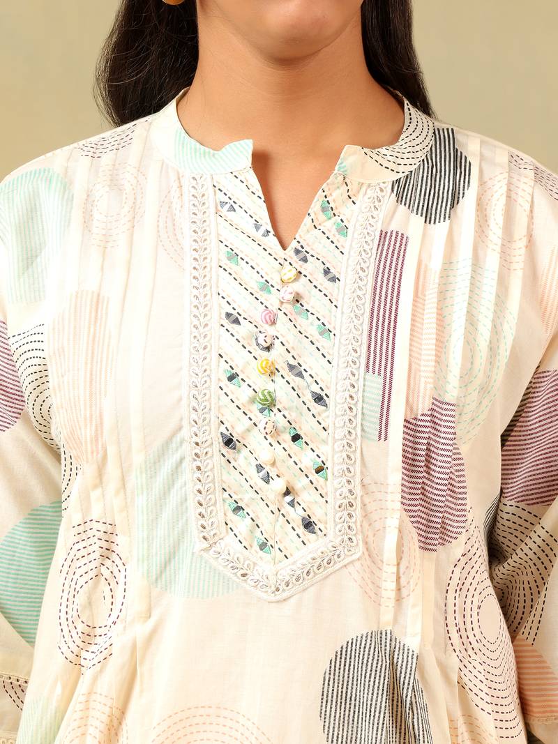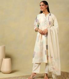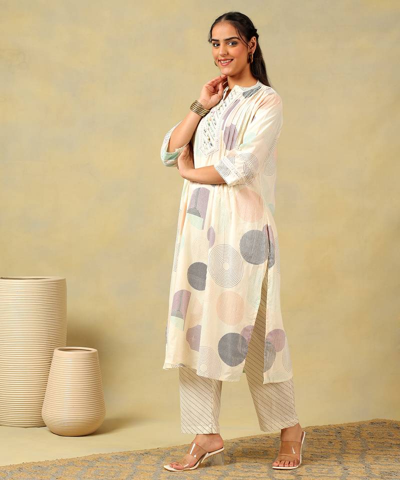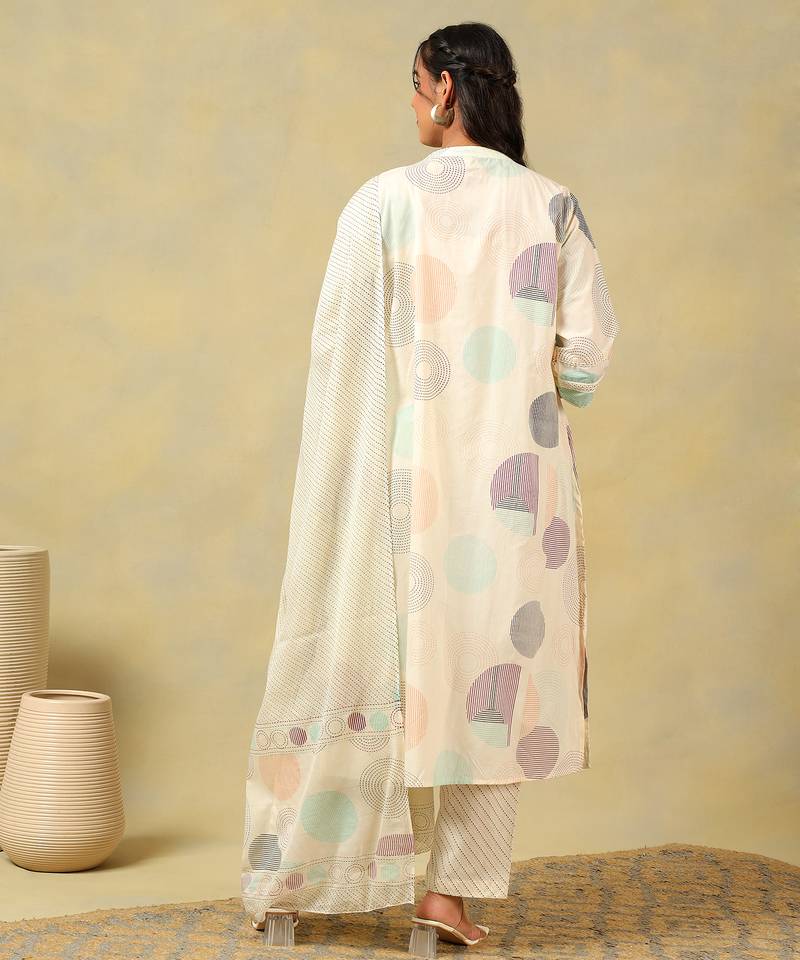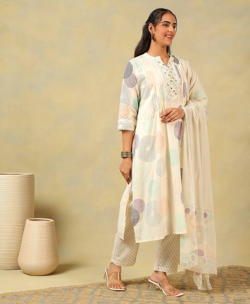 | Product Description | Exude A Soft, Contemporary Charm With Our Pari Set, Showcasing A Unique Pastel Orb Print Usp. This Elegant Ivory Ensemble Is Adorned With Artistic Circular Motifs Featuring Delicate Pinstripes And Dots In A Palette Of Sage Green, Dusty Pink, And Lemon Yellow. The Look Is Refined By An Intricately Embroidered V Notch Neckline And Subtle Lace Inserts, Paired With Micro Patterned Trousers And A Flowing, Coordinated Dupatta For A Light And Airy Traditional Silhouette. |