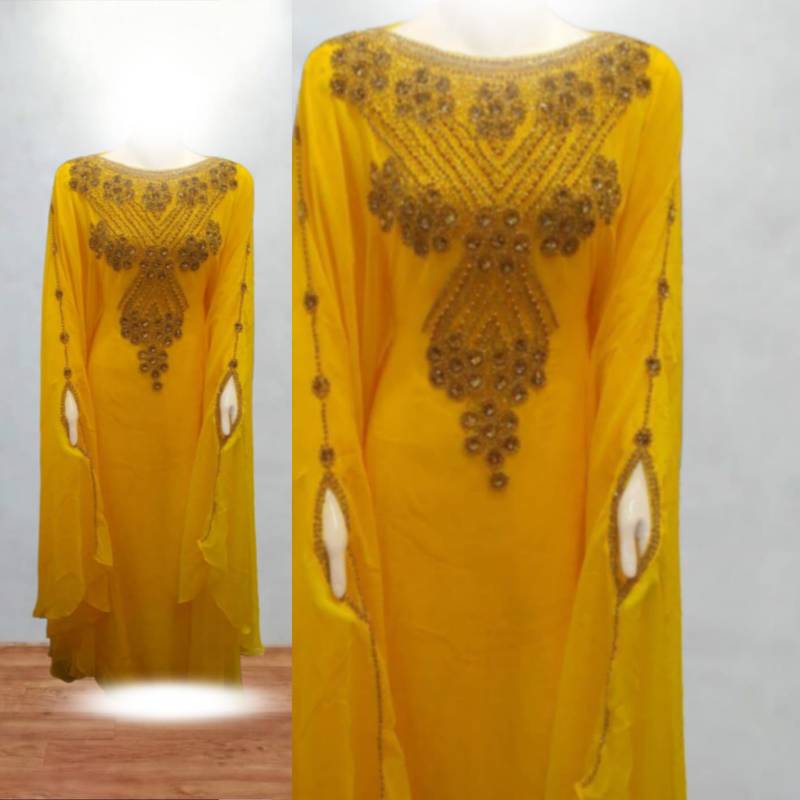 | Product Name | Luxurious Yellow Kaftan With Gold Work Stitched Dress | |