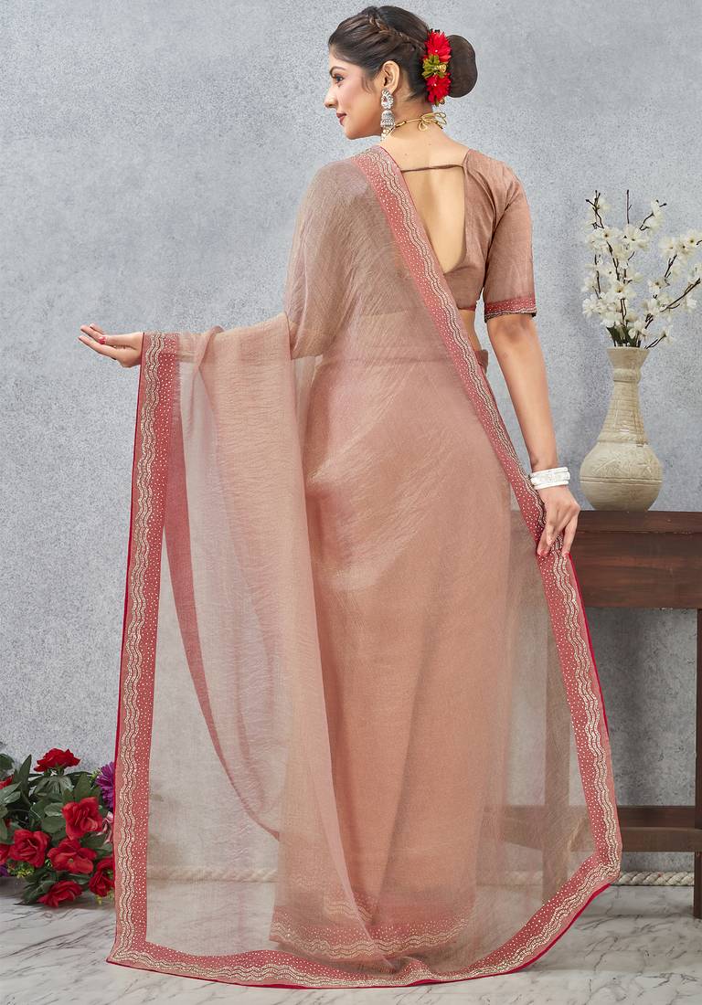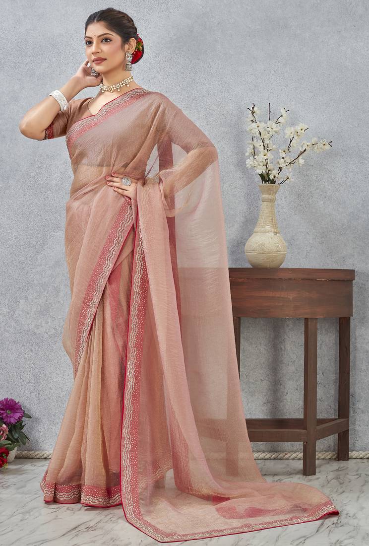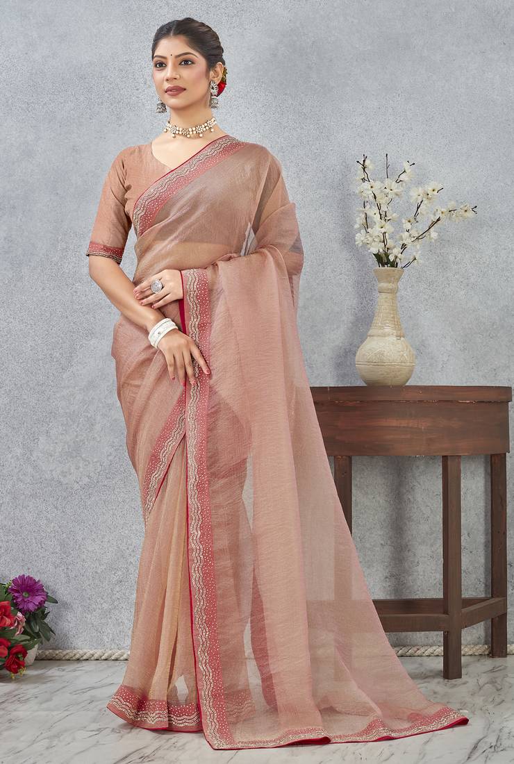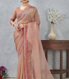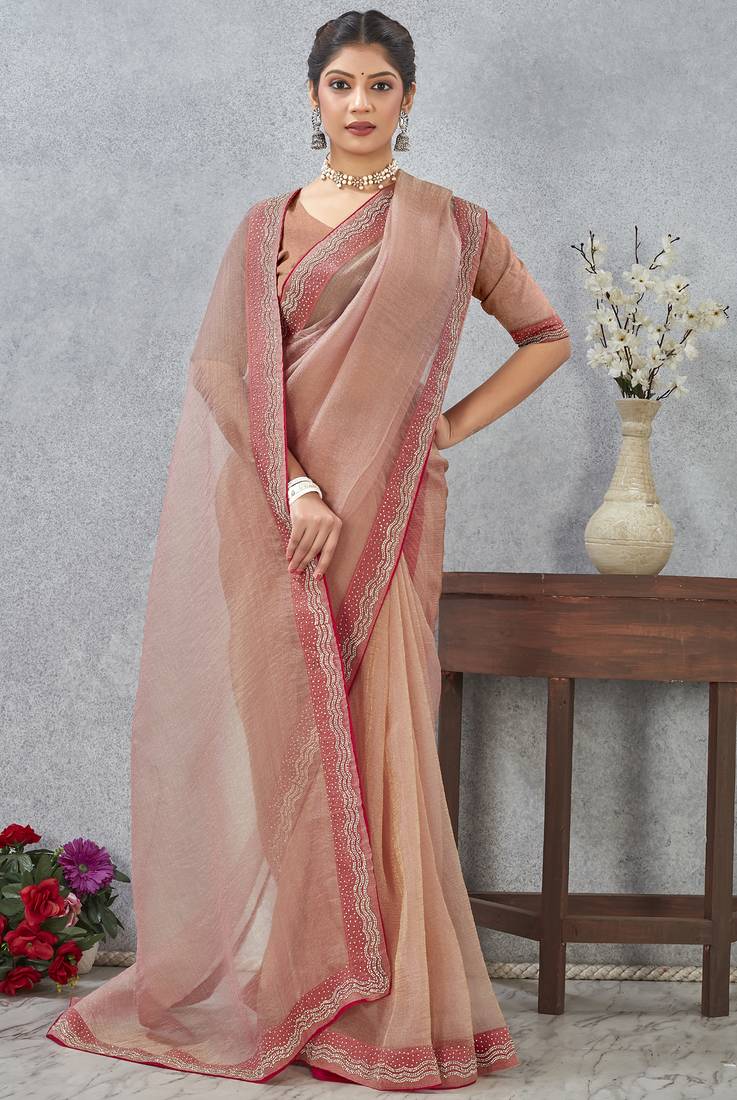 Peach zarkan embroidered work soft silk saree for women