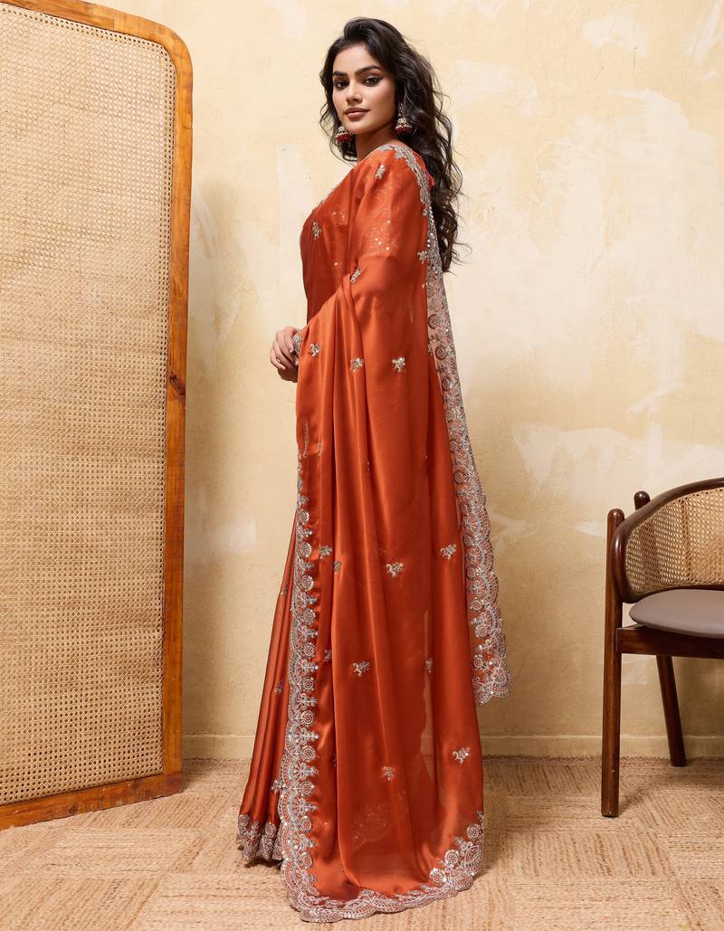 Attractive orange rangoli silk sequins embroidered indian ceremonial saree