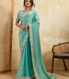 Catching firozi frendy chiffon sequins embroidered with wal-moti work indian designer wedding saree