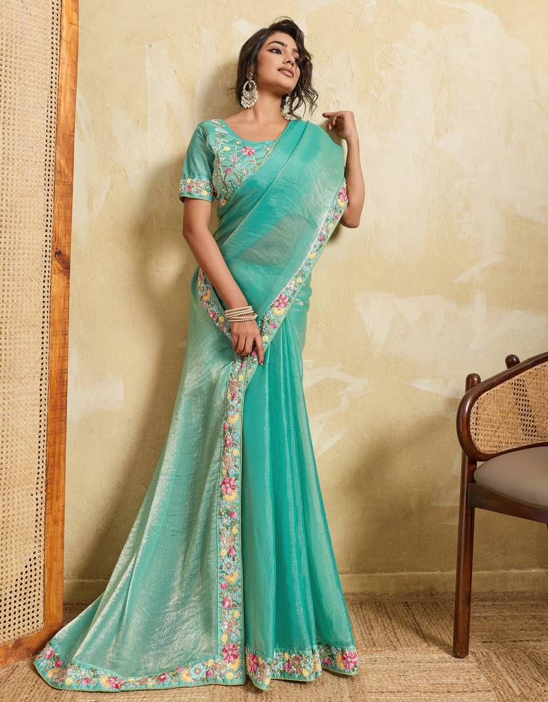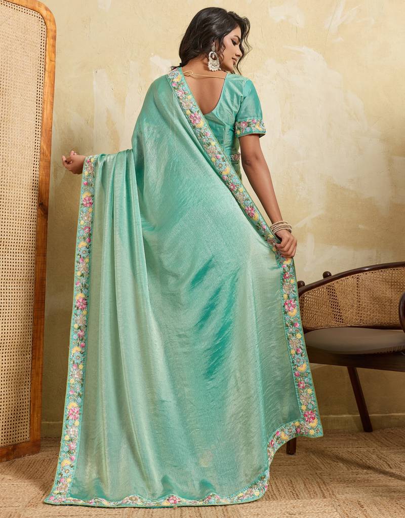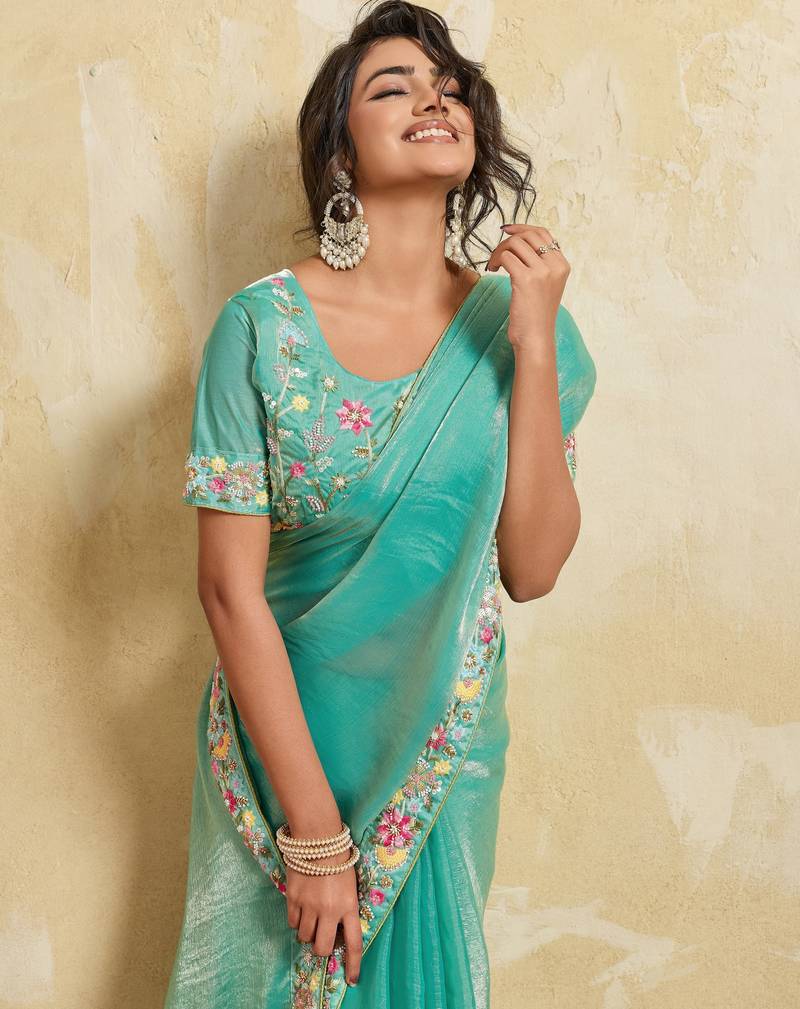 | Product Name | Catching Firozi Frendy Chiffon Sequins Embroidered With Wal Moti Work Indian Designer Wedding Saree | |