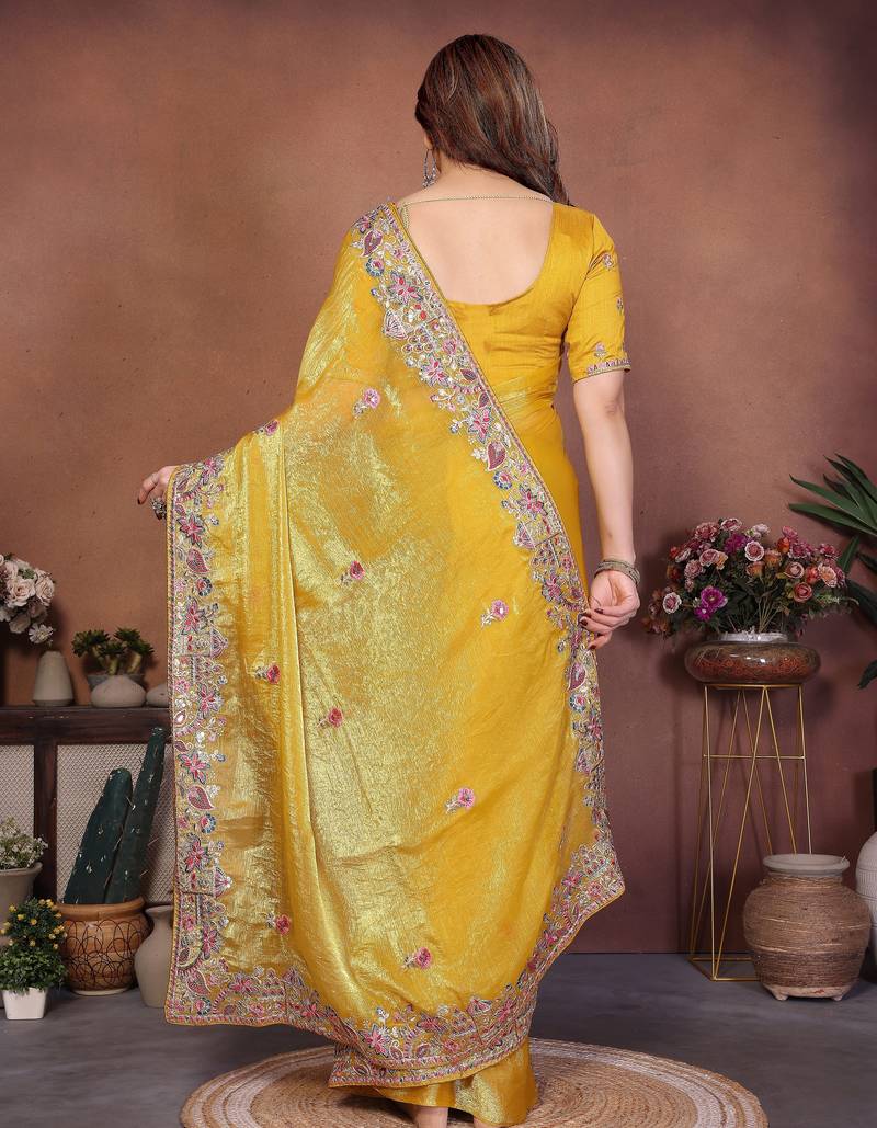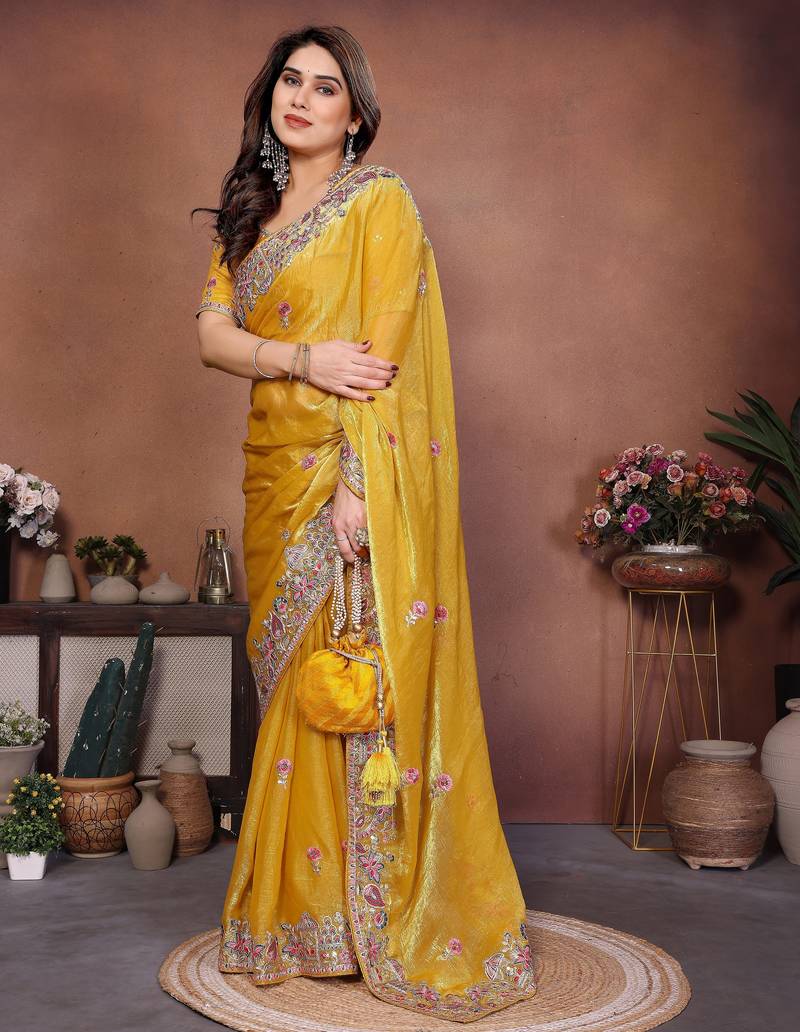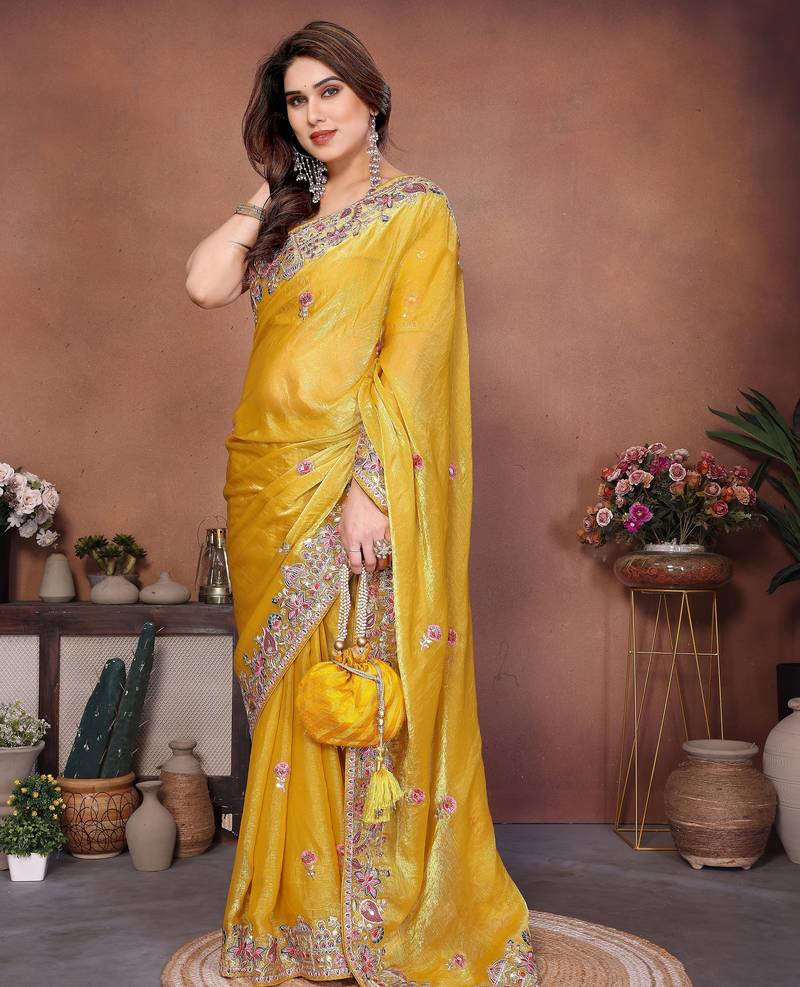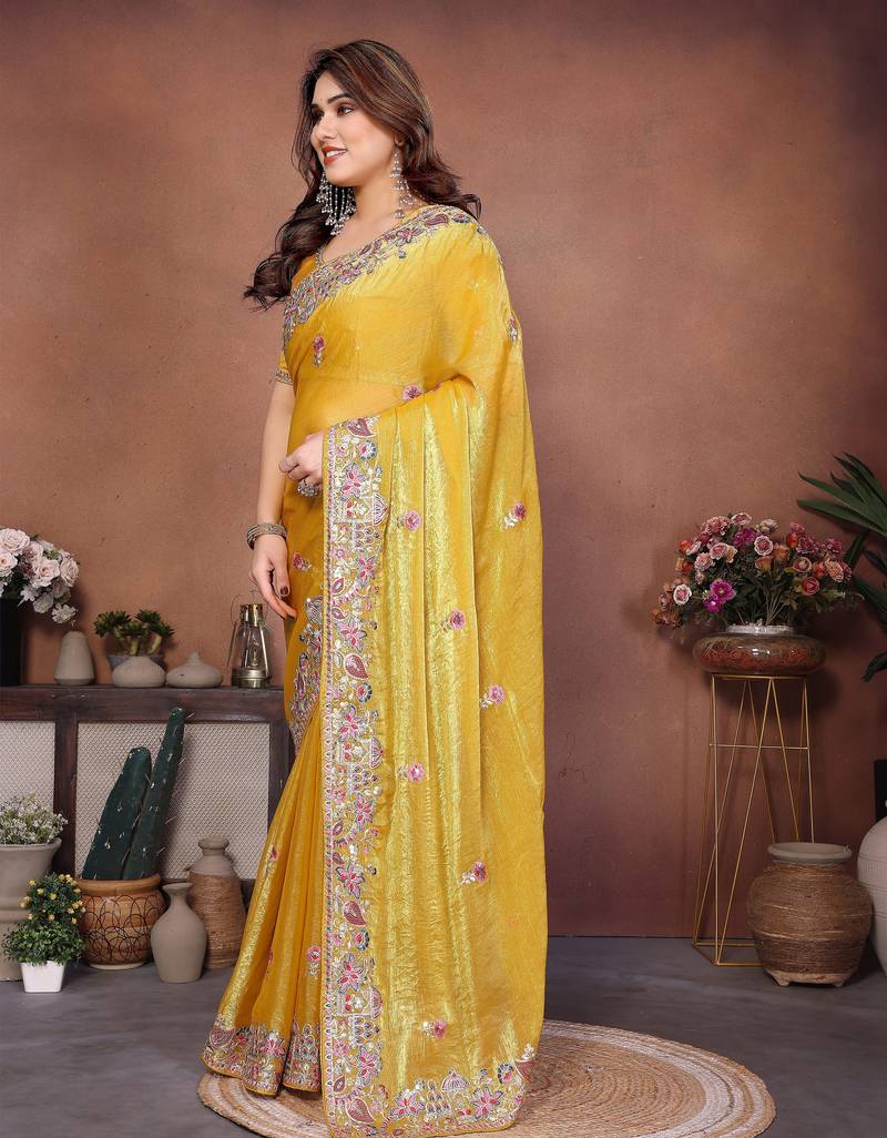 | Product Name | Enchanting Yellow Frendy Chiffon Multi Sequins Embroidered Indian Wedding Saree | |