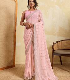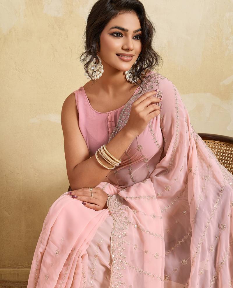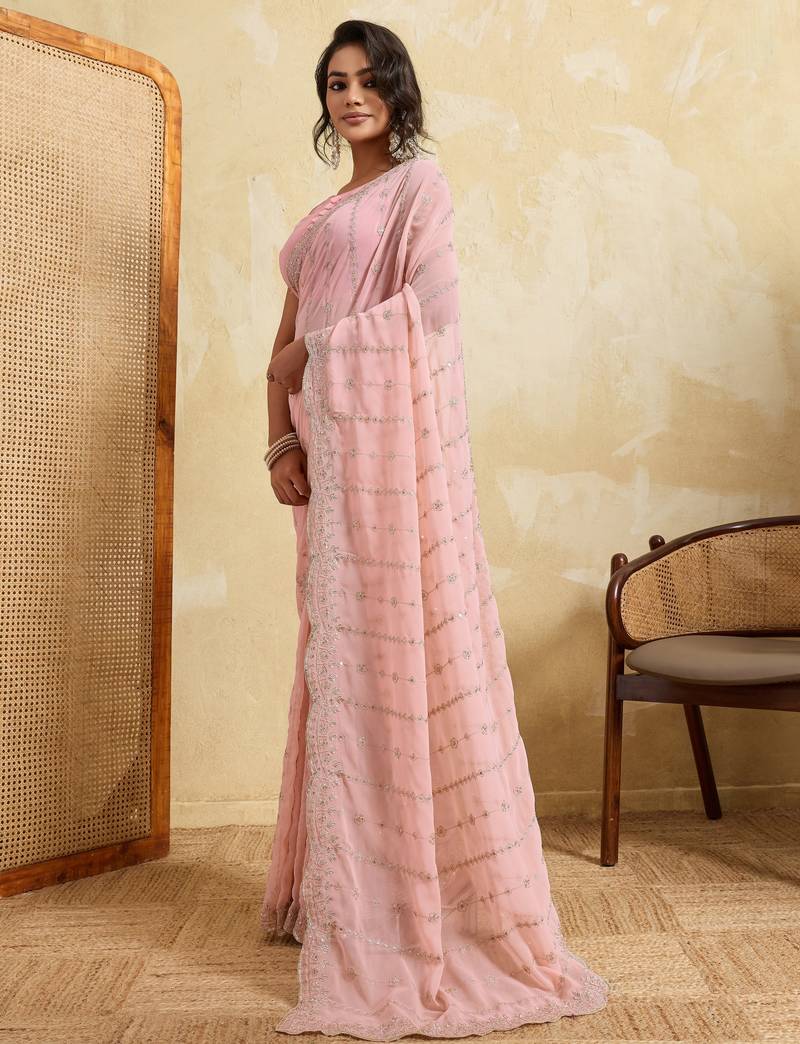 Glamourous pink georgette silk multi sequins embroidered indain festival saree
