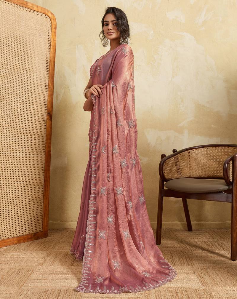 Graceful pink frendy chiffon multi sequins embroidered indina wedding saree