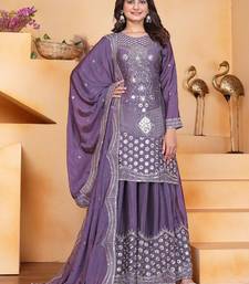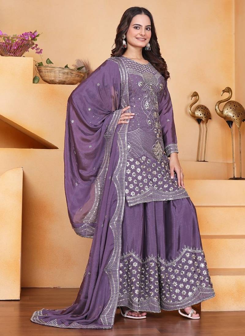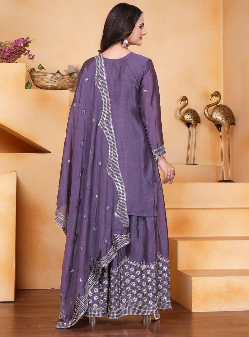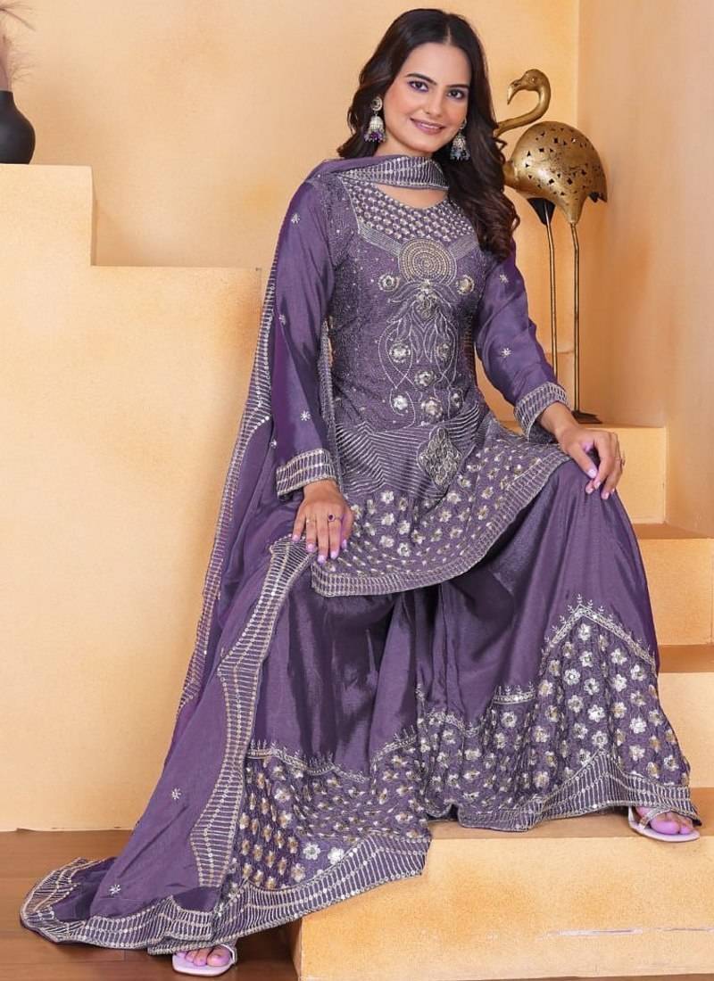 Light purple chinon silk party wear embroidery sharara suit stitched