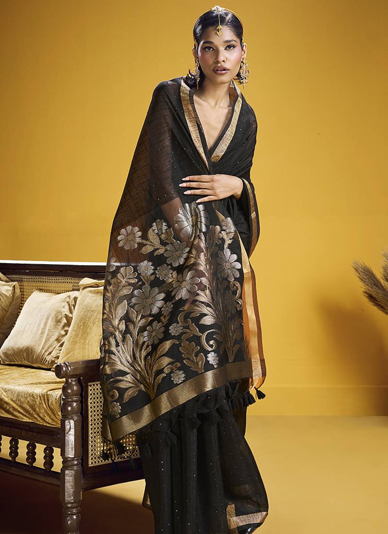 | • | Saree | : | Color- Black / Fabric- Silk Blend |