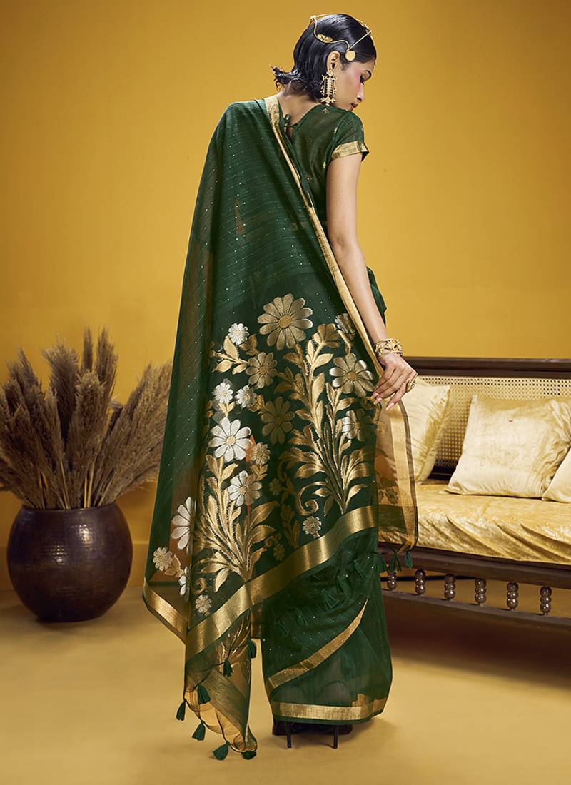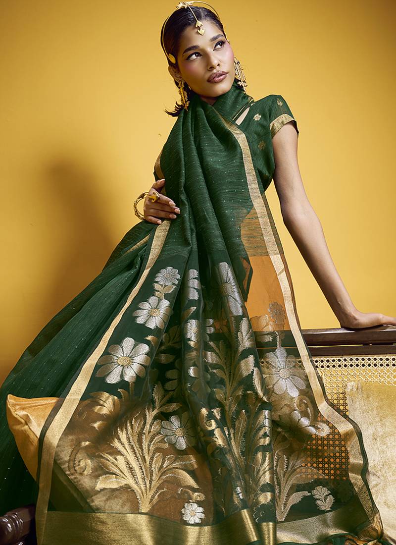 Handloom silk blend weaving dark green saree