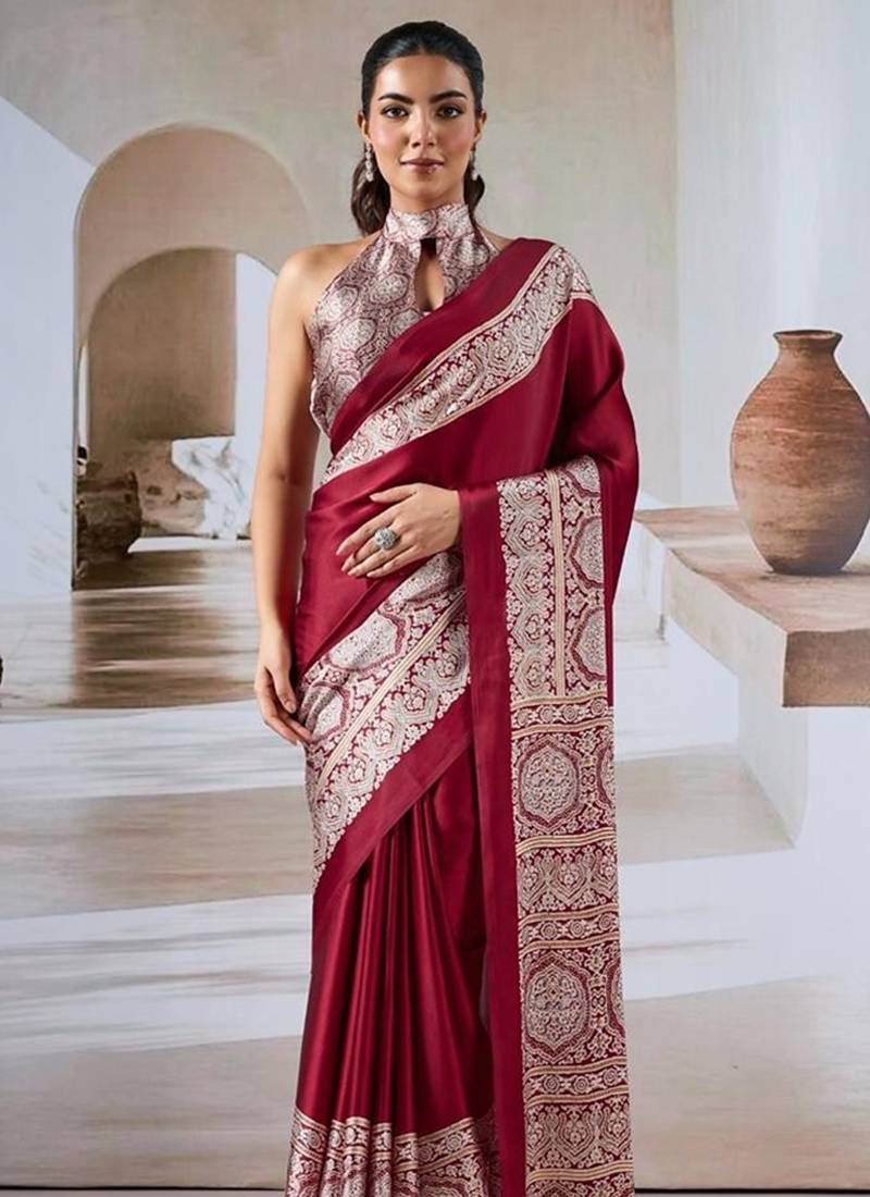 This Maroon Satin Saree Is Adding The Desirable Glamorous Displaying The Feel Of Cute And Graceful. The Appealing Printed Work All Through The Dress Is Awe Inspiring. Comes With Matching Blouse. (Slight Variation In Color, Fabric & Work Is Possible. Model Images Are Only Representative.)