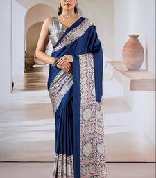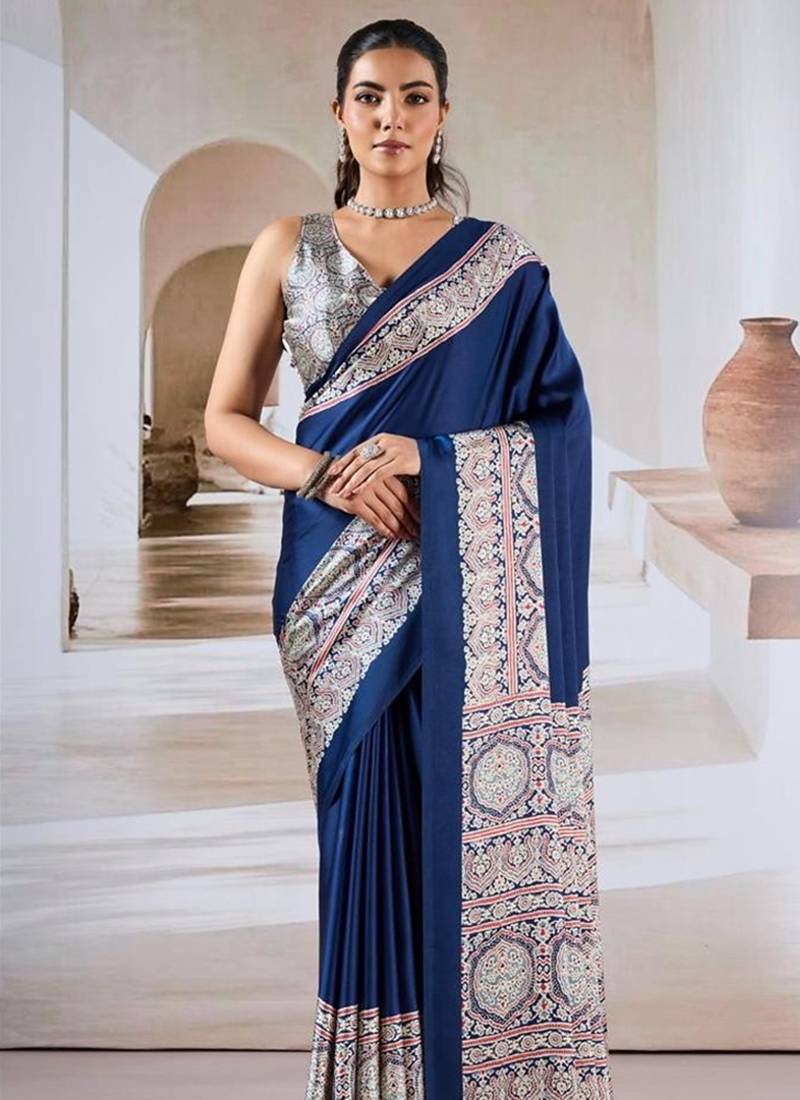 Navy blue ajrakh print modal satin saree