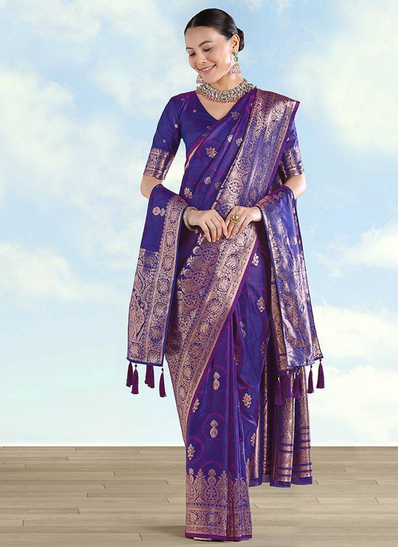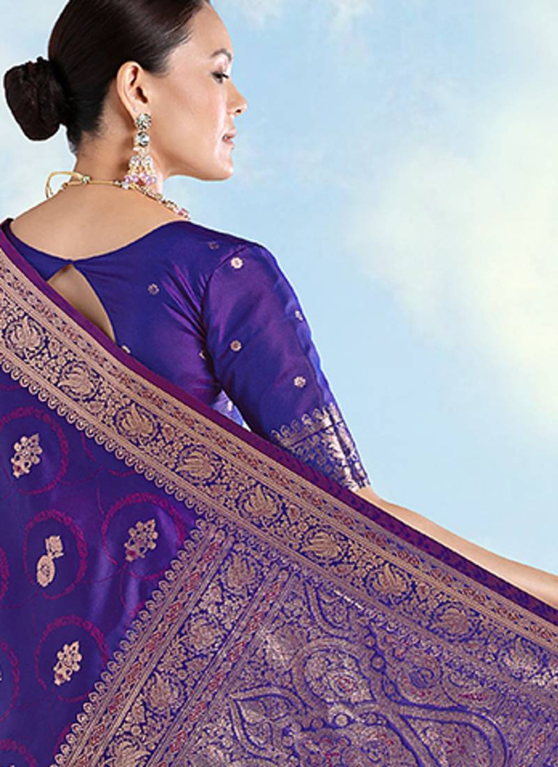 | Product Description | Purple Banarasi Silk Zari Woven Traditional Saree. This Gorgeous Attire Is Displaying Some Amazing Woven Done With Fancy Zari Woven Dupatta. Comes With Matching Blouse Perfect For Festive And Traditional Occasions. |