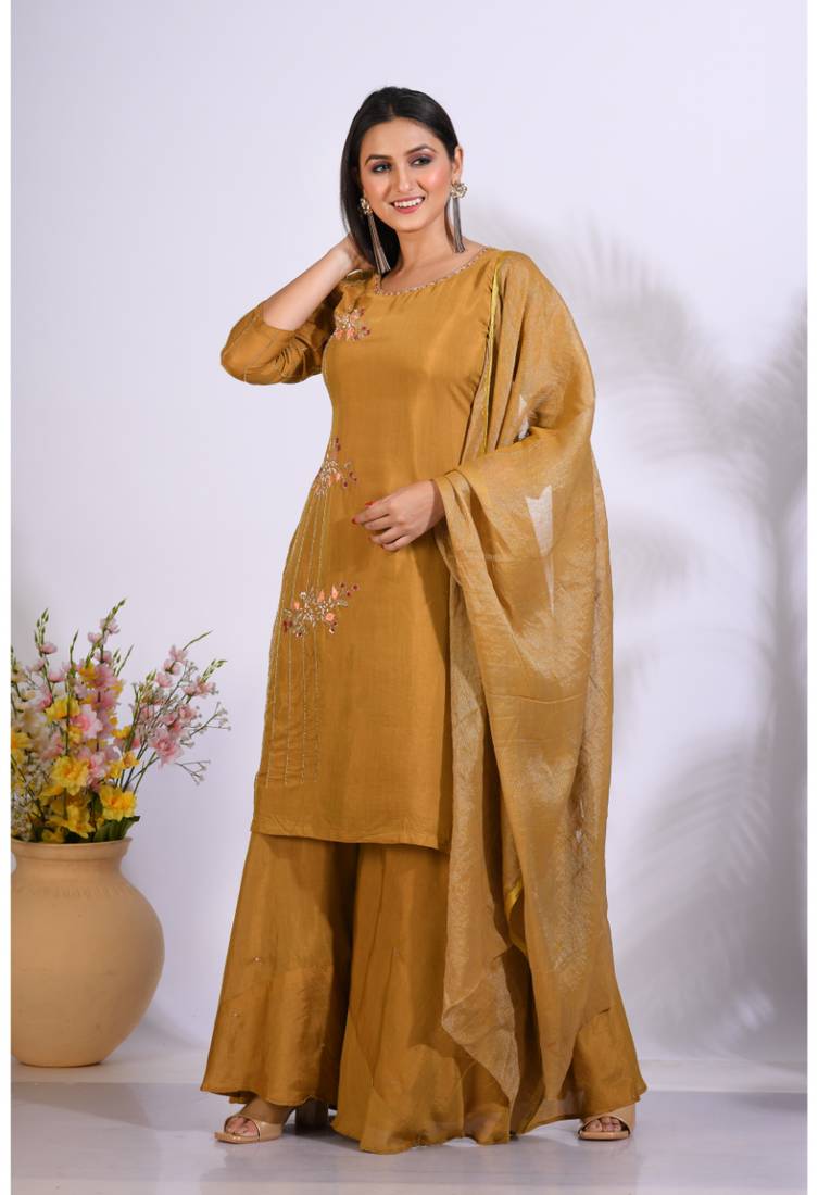 Mustard handwork kurta and palazzo with dupatta set stitched