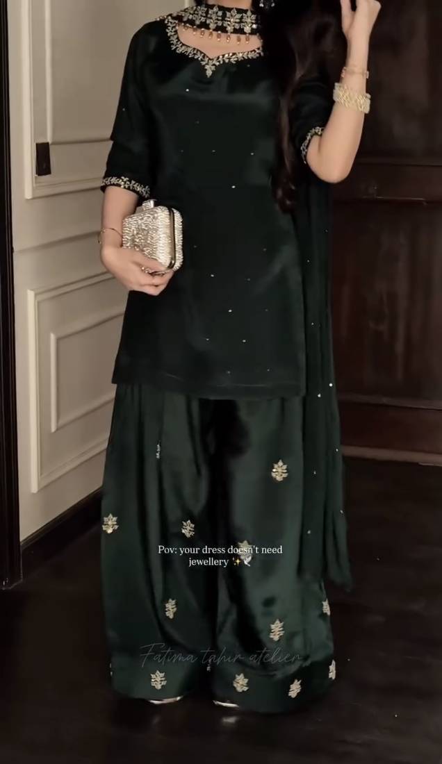 Black crep silk embroidery work farshi salwar kameez with dupatta size up to 42 stitched