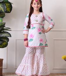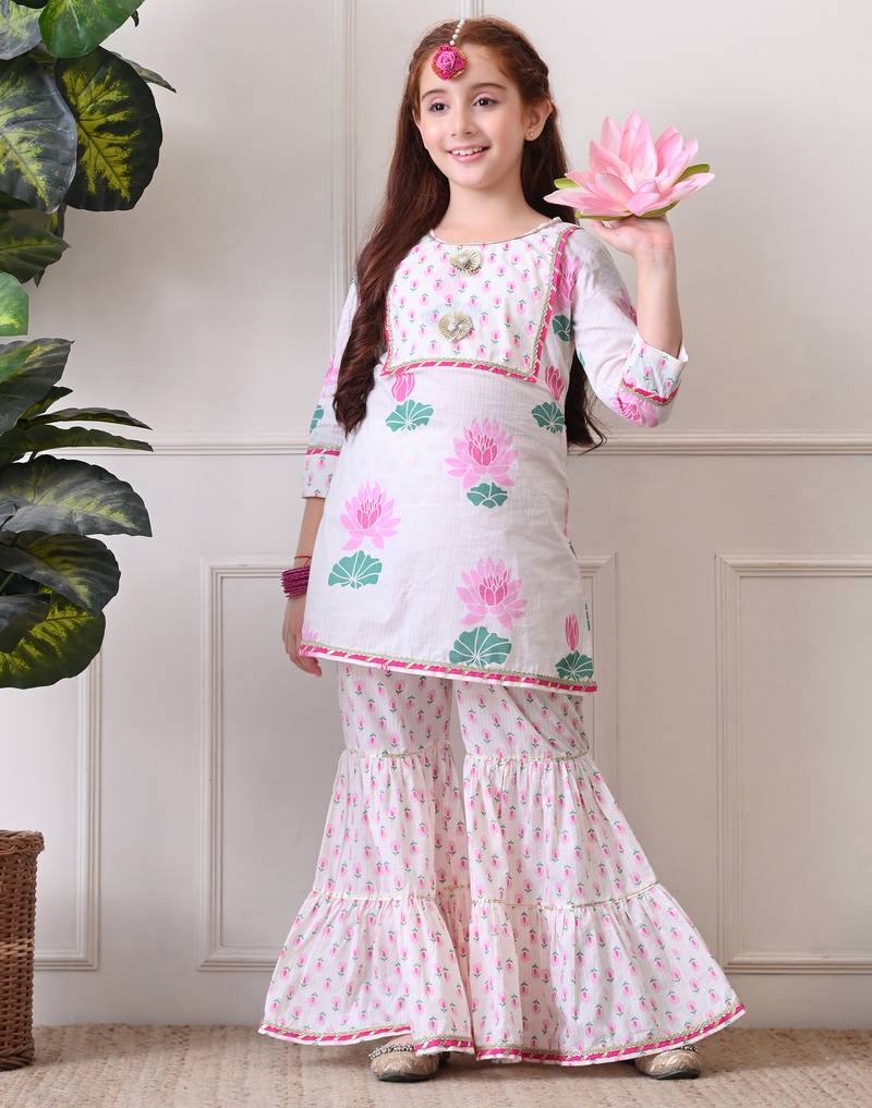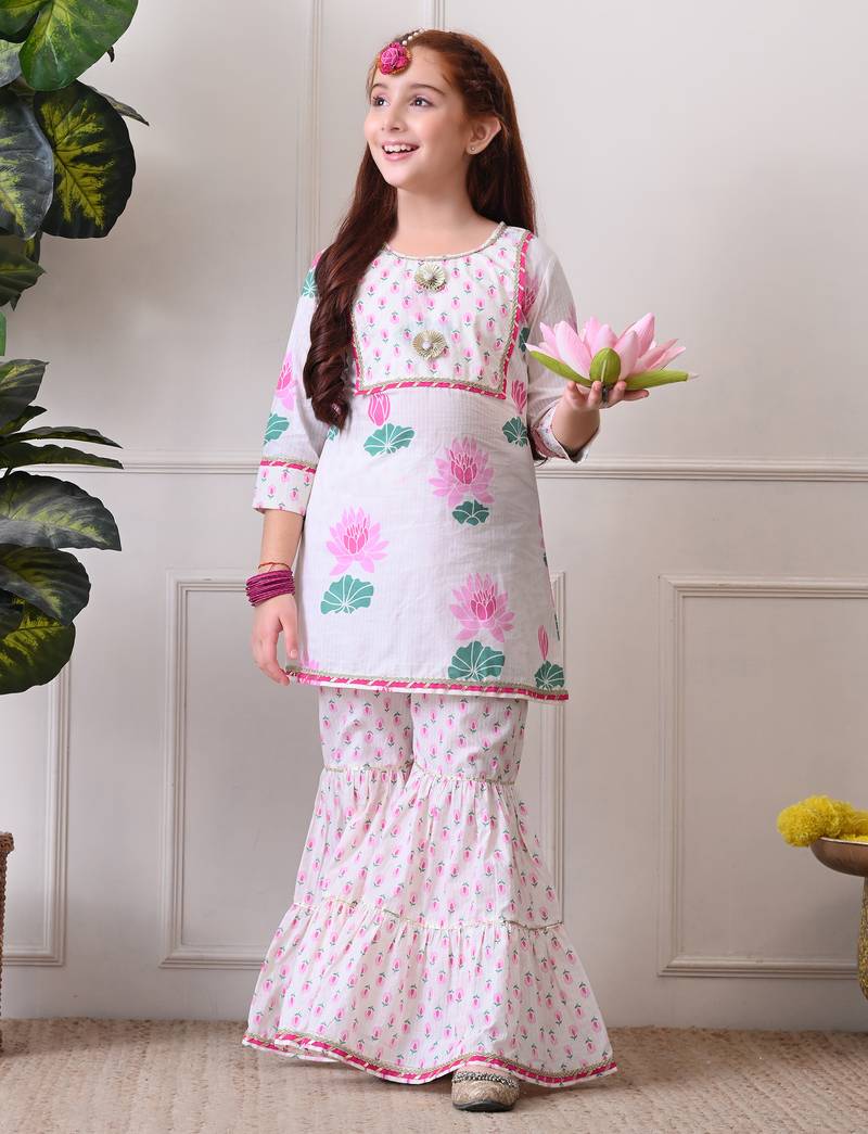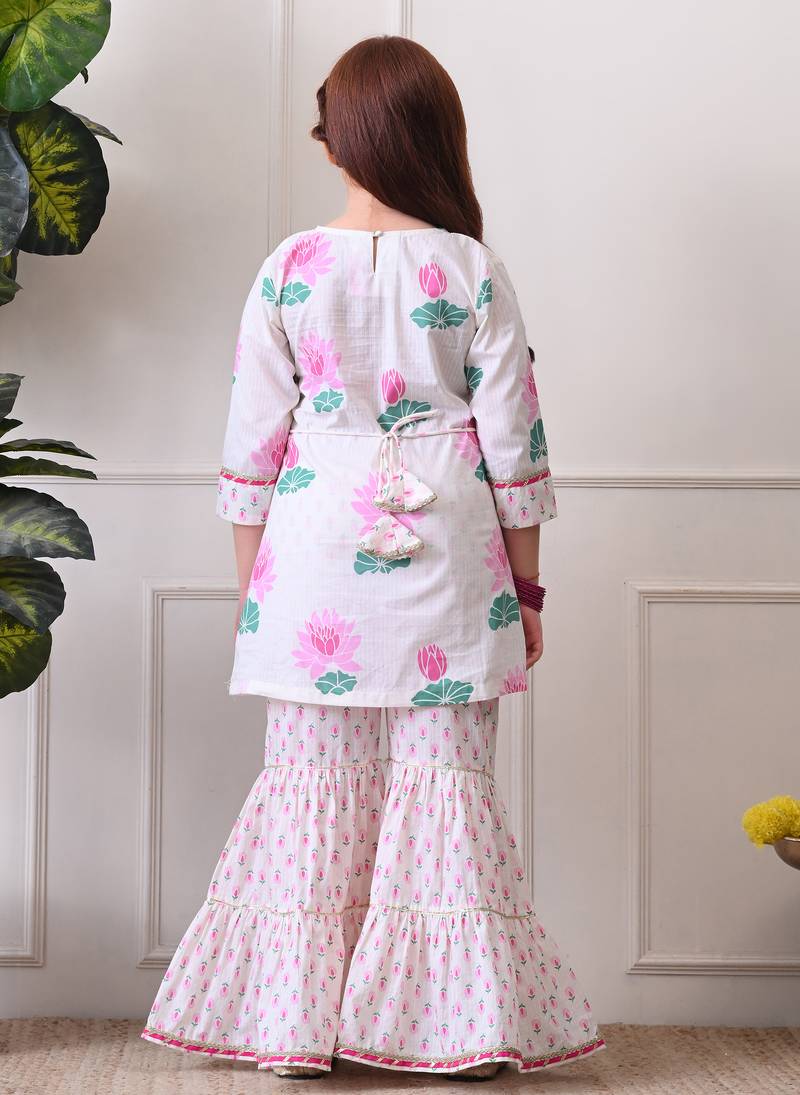 Girl's floral printed kurta sharara set pink lotus print. ilks001