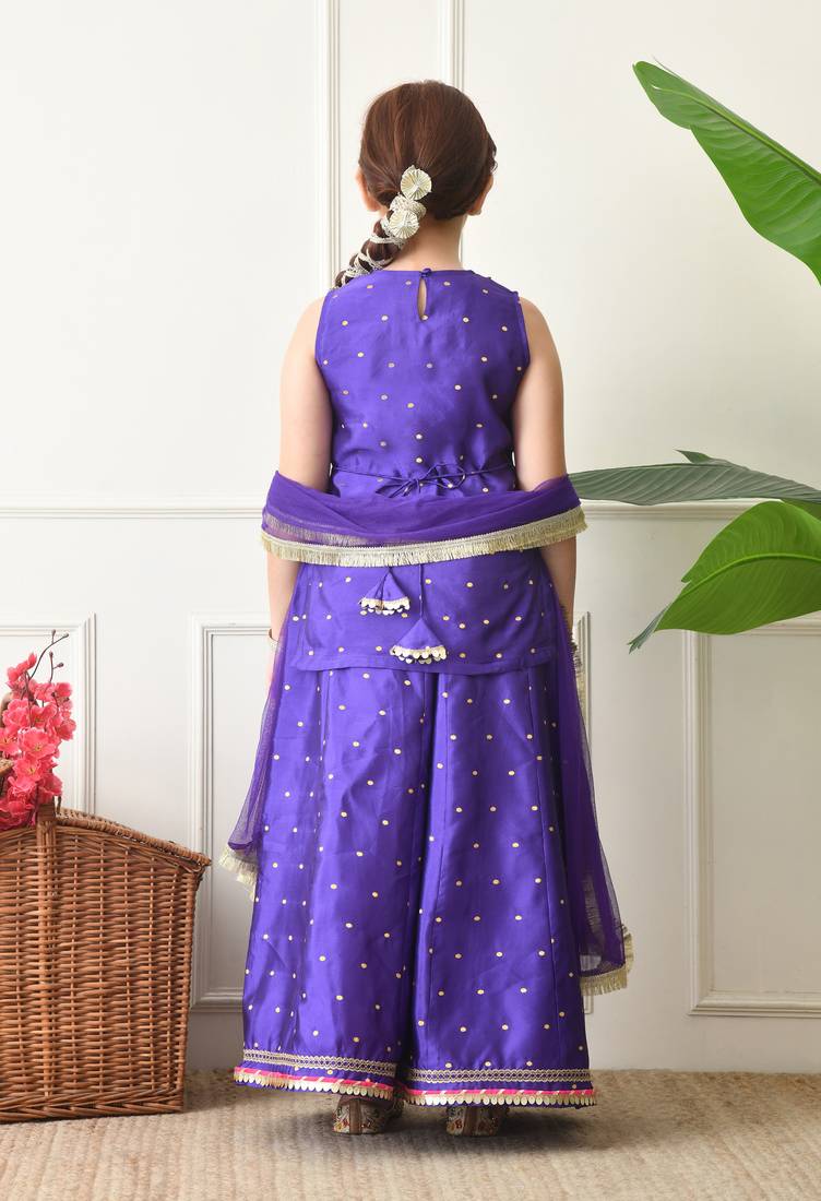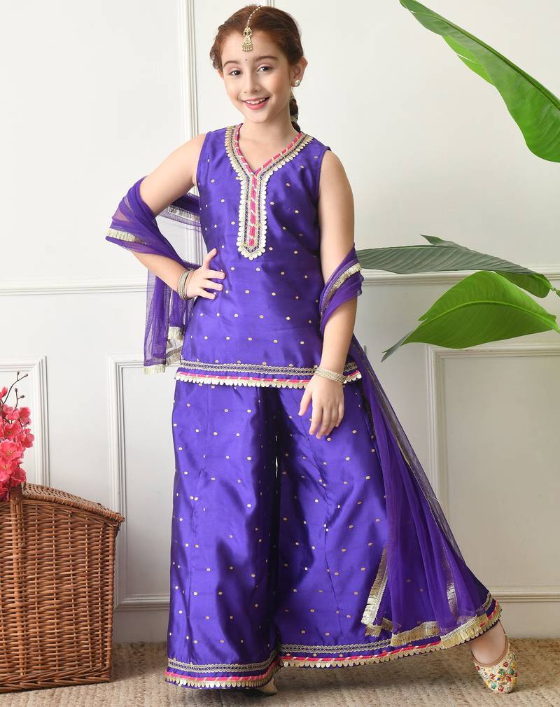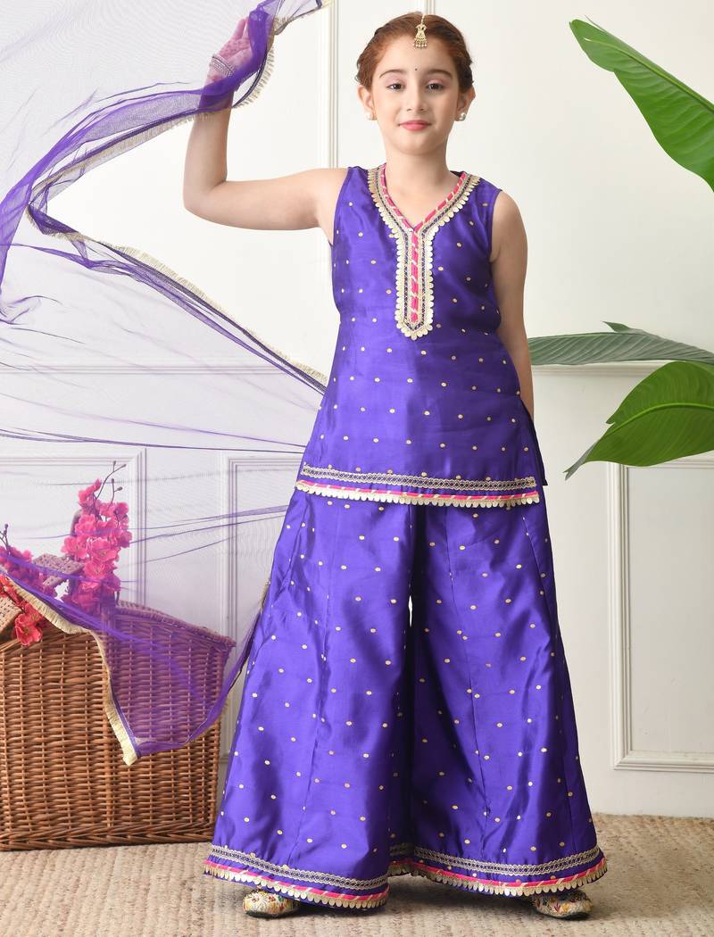 | Product Description | Purple Kurti With Sharara Set For Girls. The Outfit Features A Sleeveless Kurti With Delicate Woven Motifs And A Shimmering Golden Lace Border, Paired With A Matching Flared Sharara And A Soft Net Dupatta. Designed For Comfort And Style, This Traditional Ensemble Is Perfect For Weddings, Festive Events, And Family Celebrations. |
