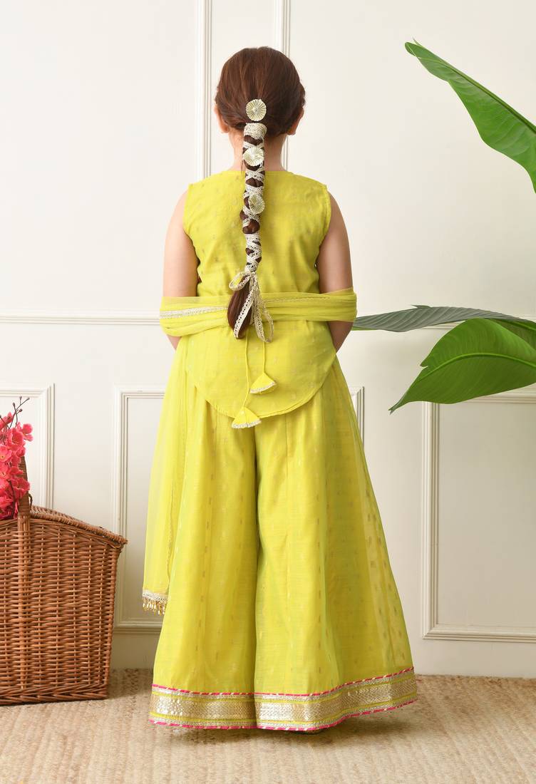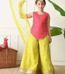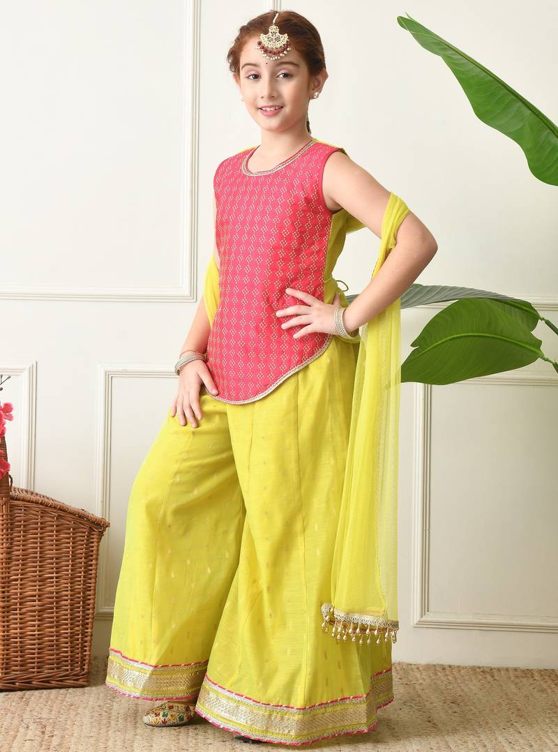 Girls traditional ethnic set pink sleeveless kurti with lime yellow sharara & dupatta ilksd17