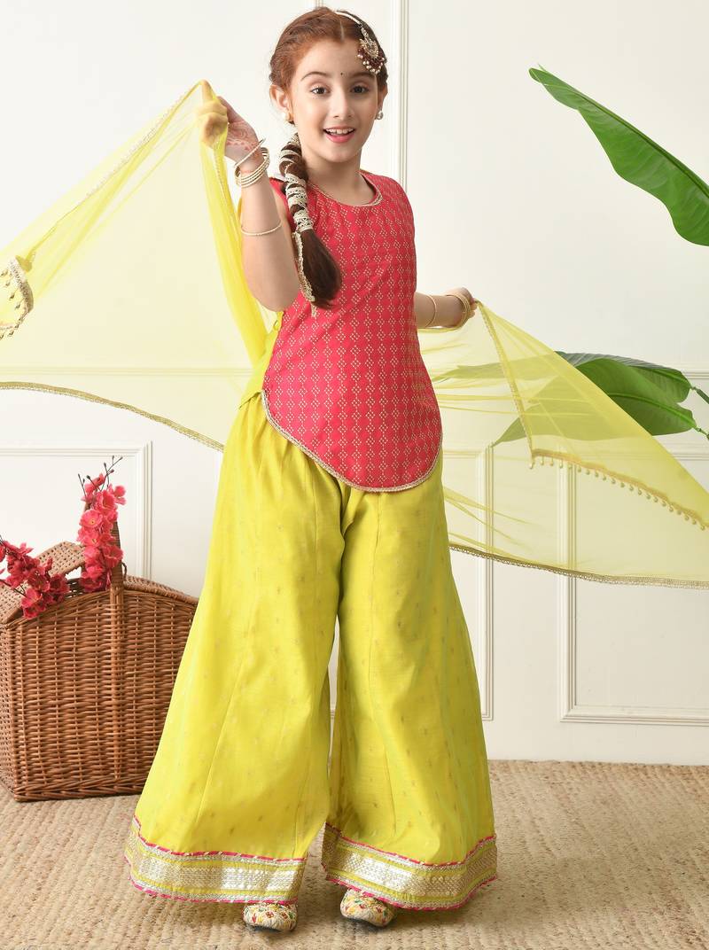 | Product Name | Girls Traditional Ethnic Set Pink Sleeveless Kurti With Lime Yellow Sharara & Dupatta Ilksd17 | |