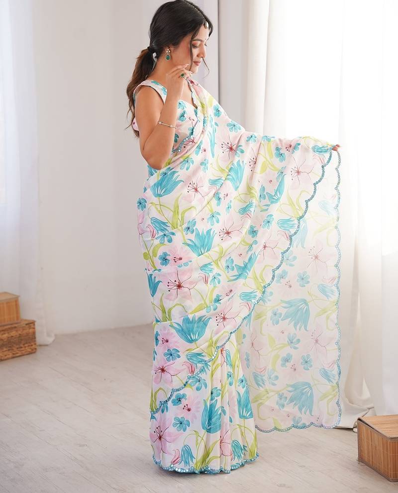 Women party wear digital print heavy chinnon saree with un sttiched blouse
