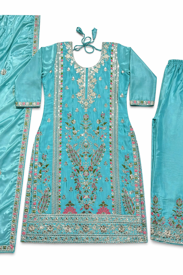 Blue silk kurta heavy embroidery coding sequence work with palazzo and dupatta 3pc set