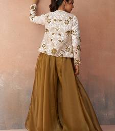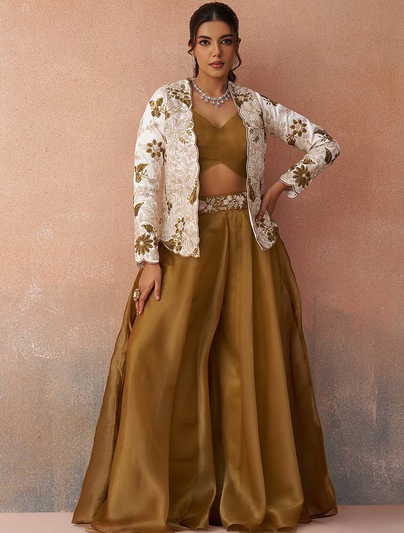 | Product Name | Golden Mustard Tissue Floral Embroidered Crop Top With Jacket & Palazzo Set | |