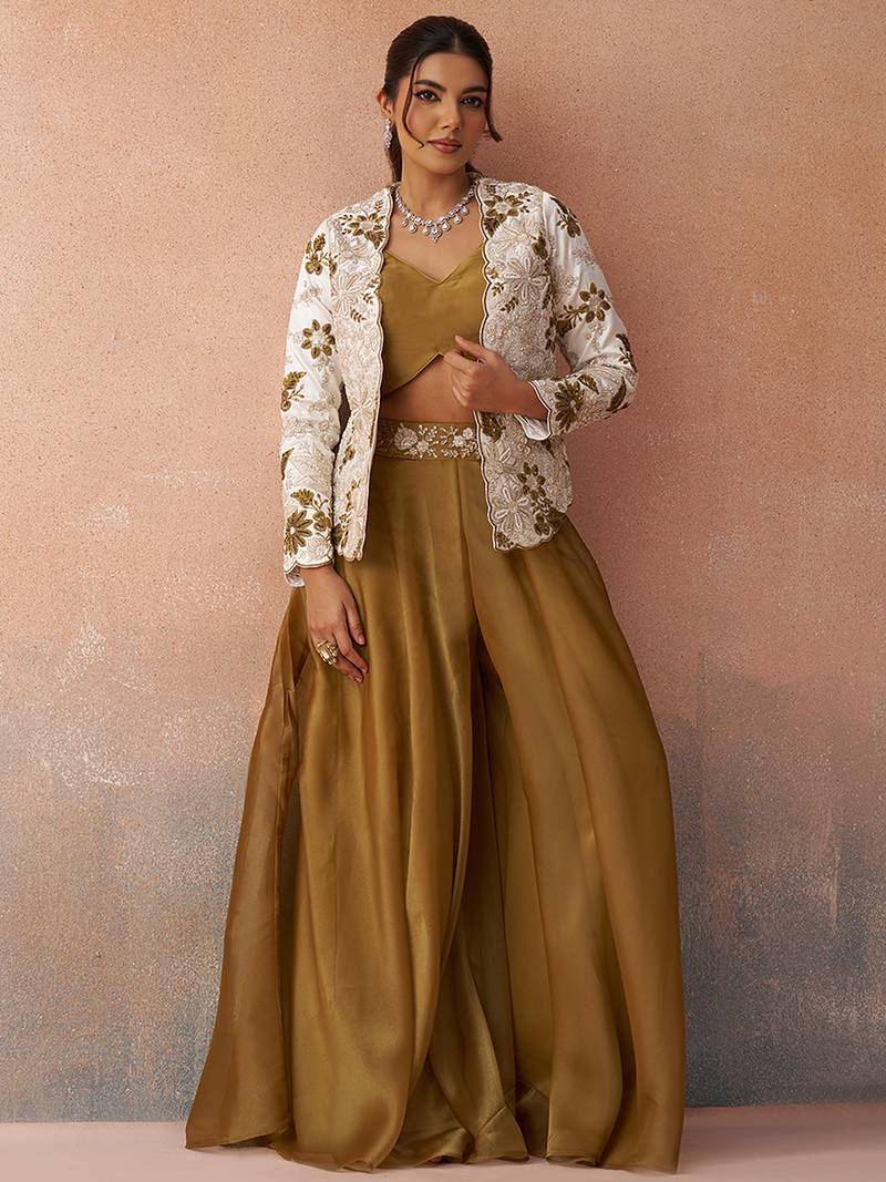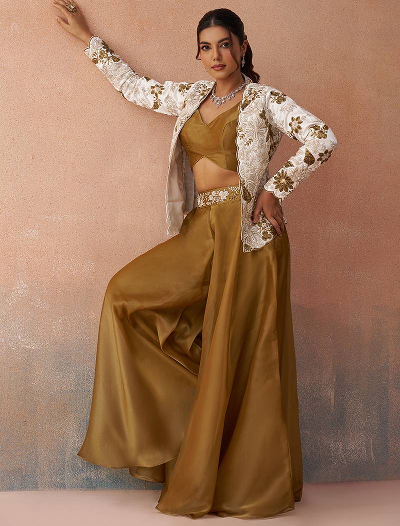 Golden mustard tissue floral embroidered crop top with jacket & palazzo set