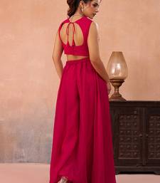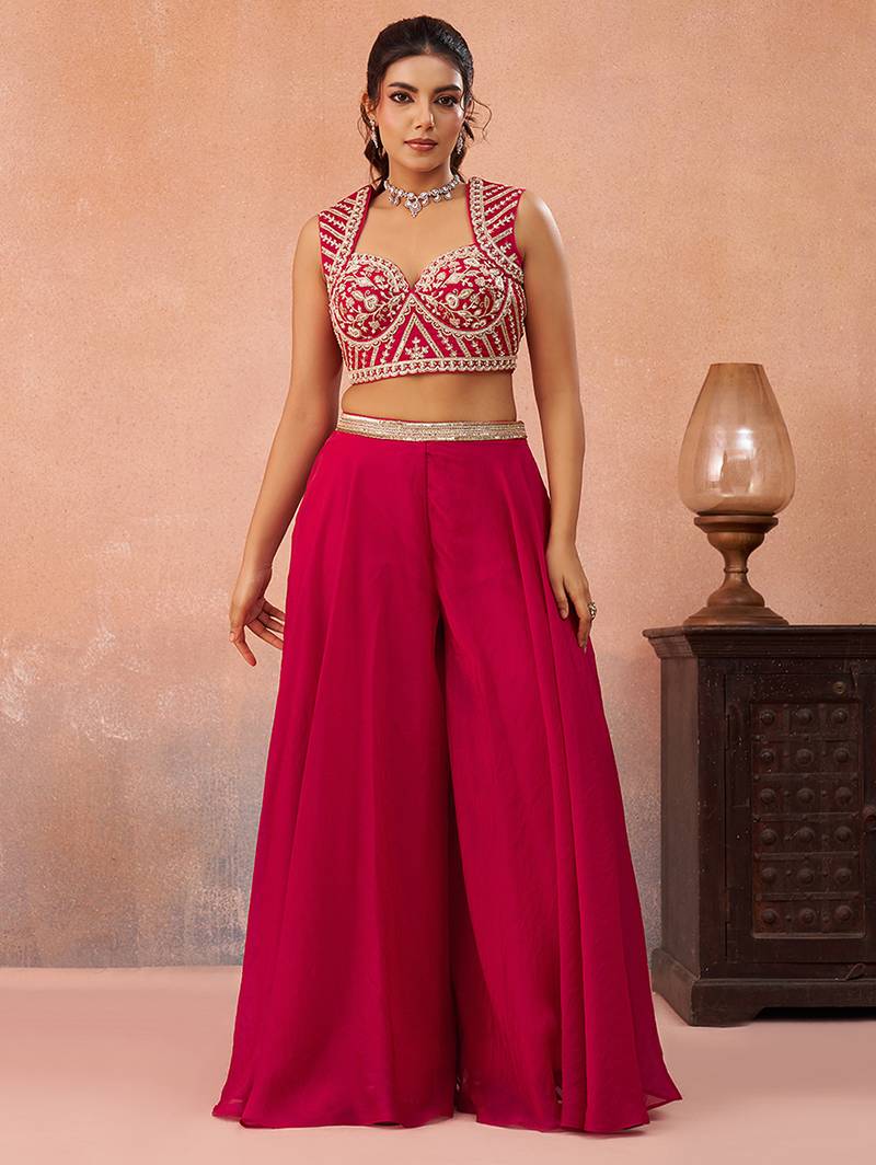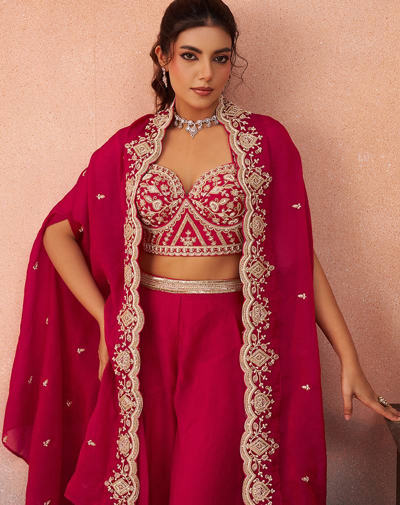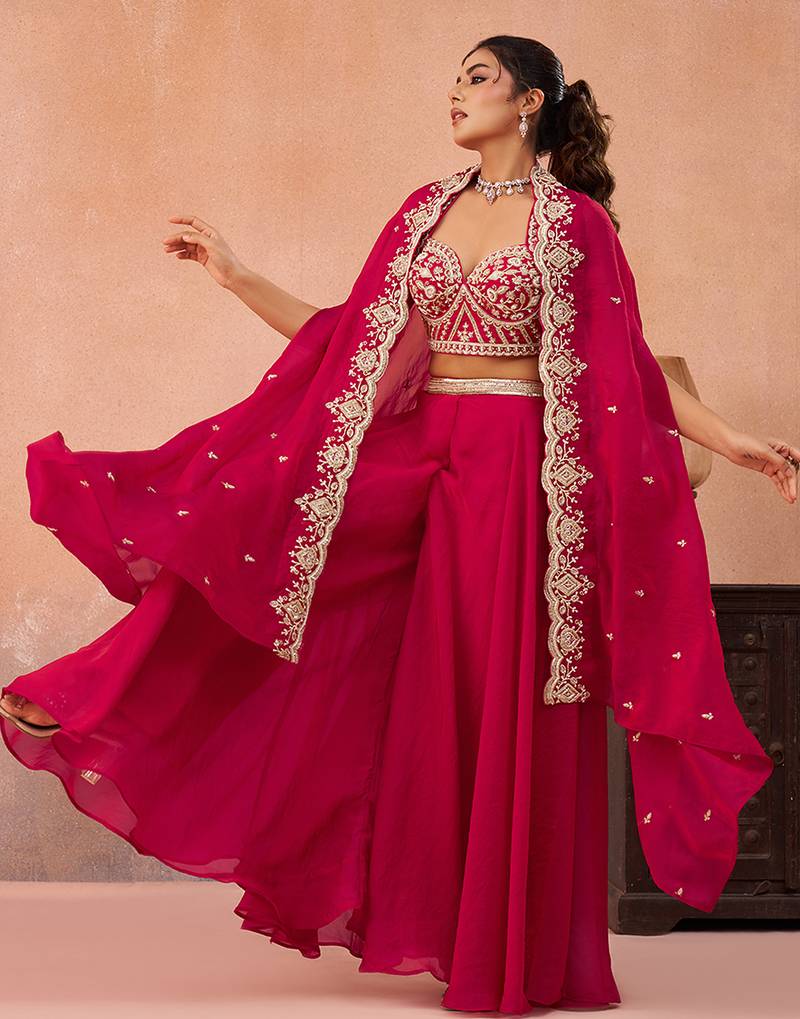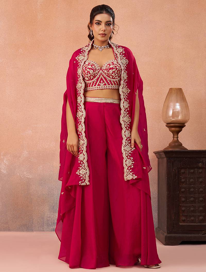 | Product Name | Pink Organza Beads Embroidered Crop Top With Flared Cape & Flared Palazzo Set | |