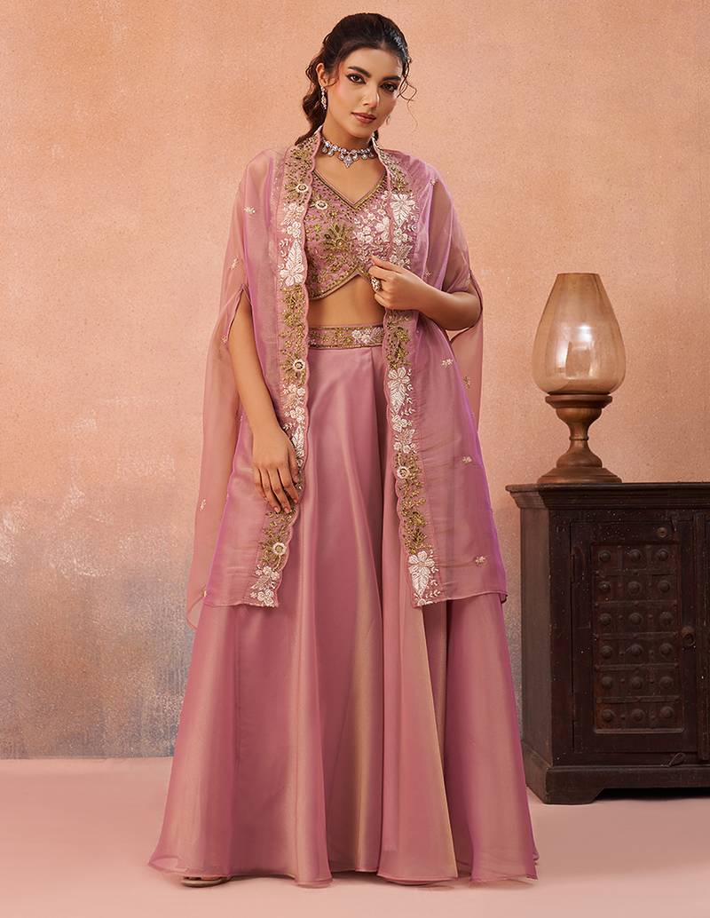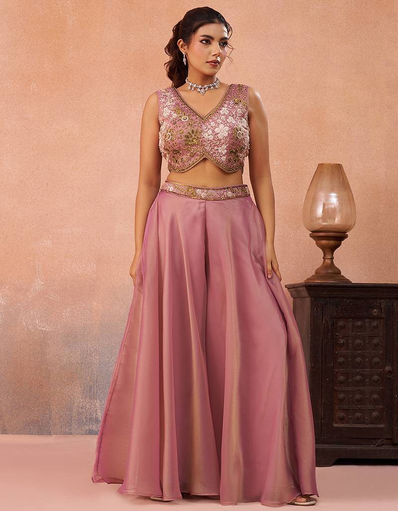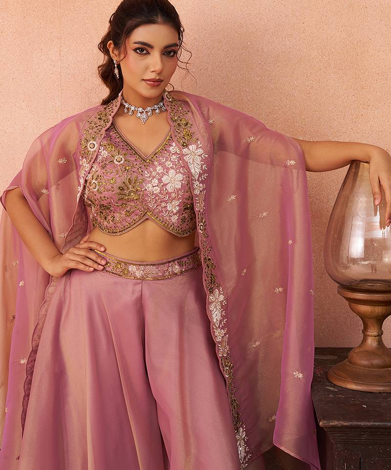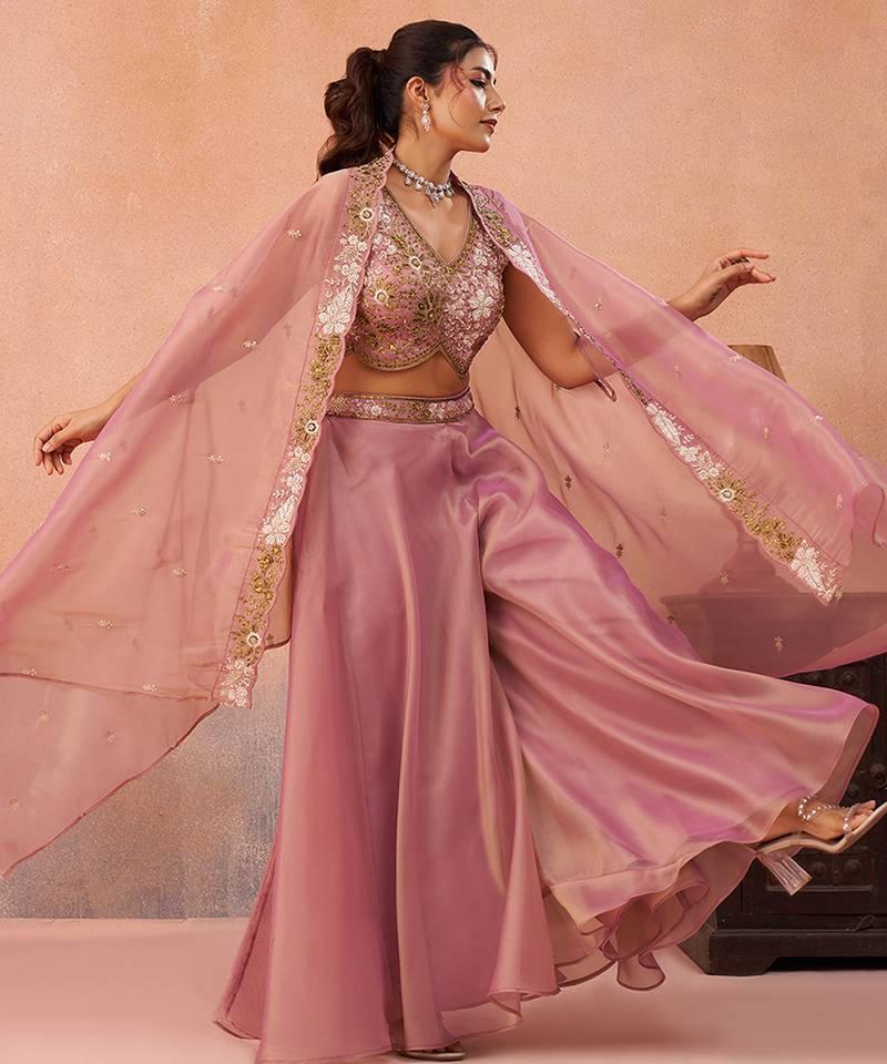 | Product Name | Pink Tissue Beads Embroidered Crop Top With Flared Cape & Flared Palazzo Set | |