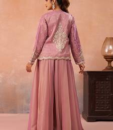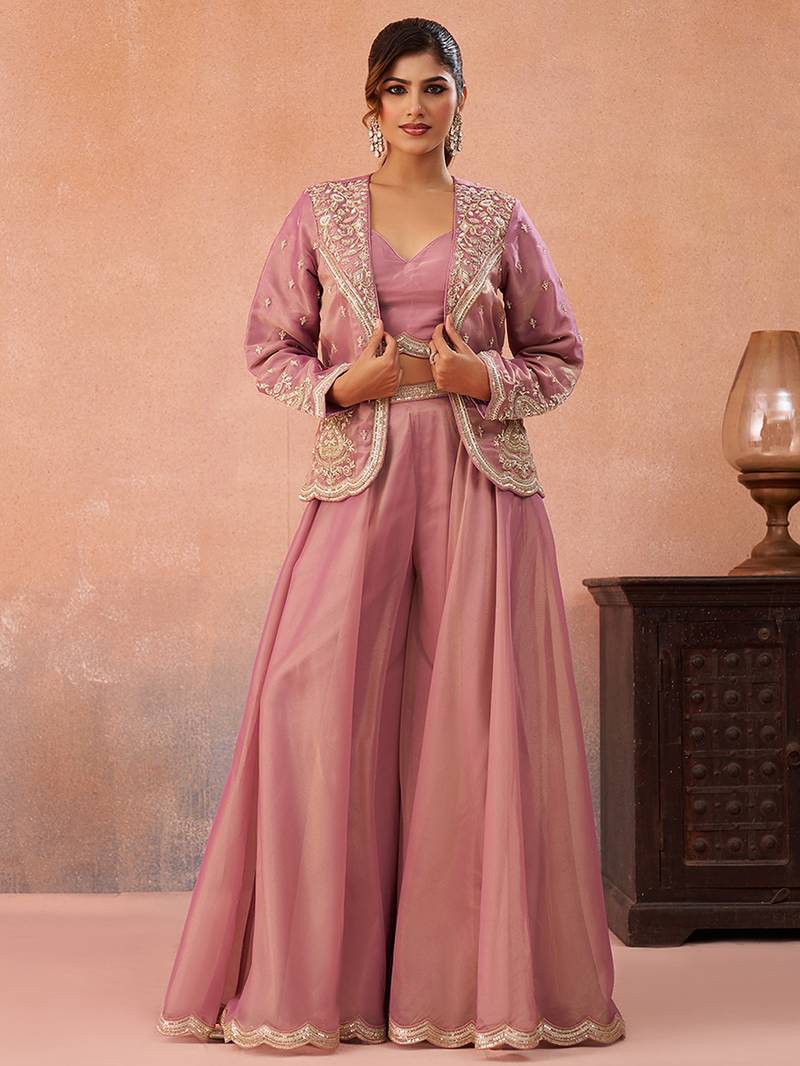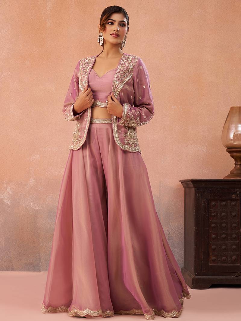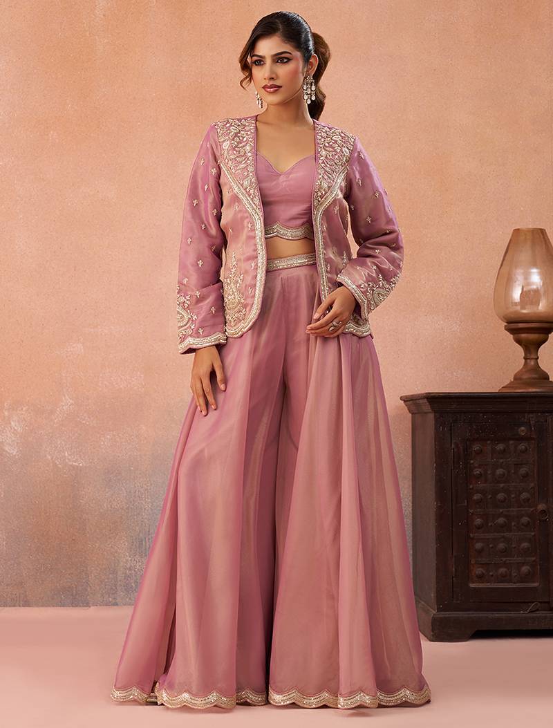 | Product Name | Pink Tissue Floral Embroidered Crop Top With Jacket & Flared Palazzo Set | |