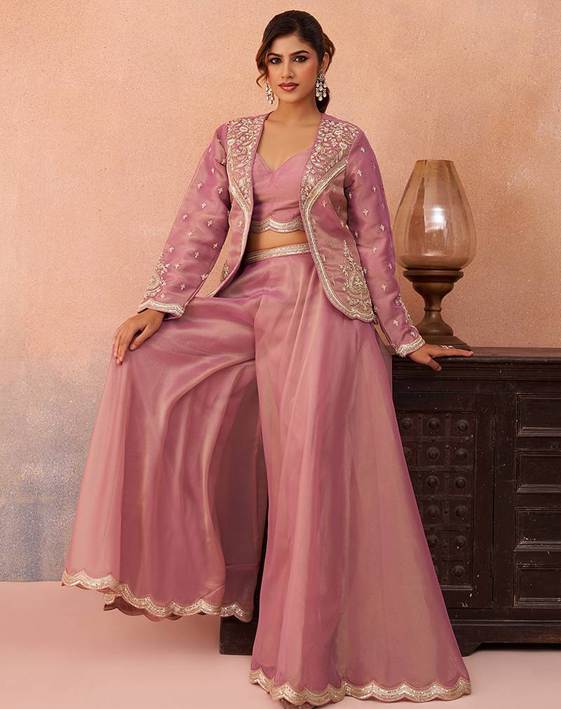 Pink tissue floral embroidered crop top with jacket & flared palazzo set