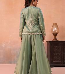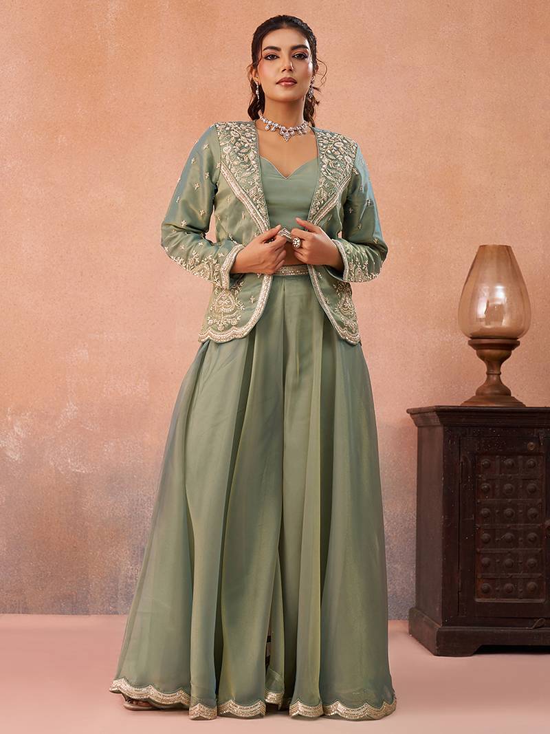 | Product Name | Sage Green Tissue Floral Embroidered Crop Top With Jacket & Flared Palazzo Set | |
