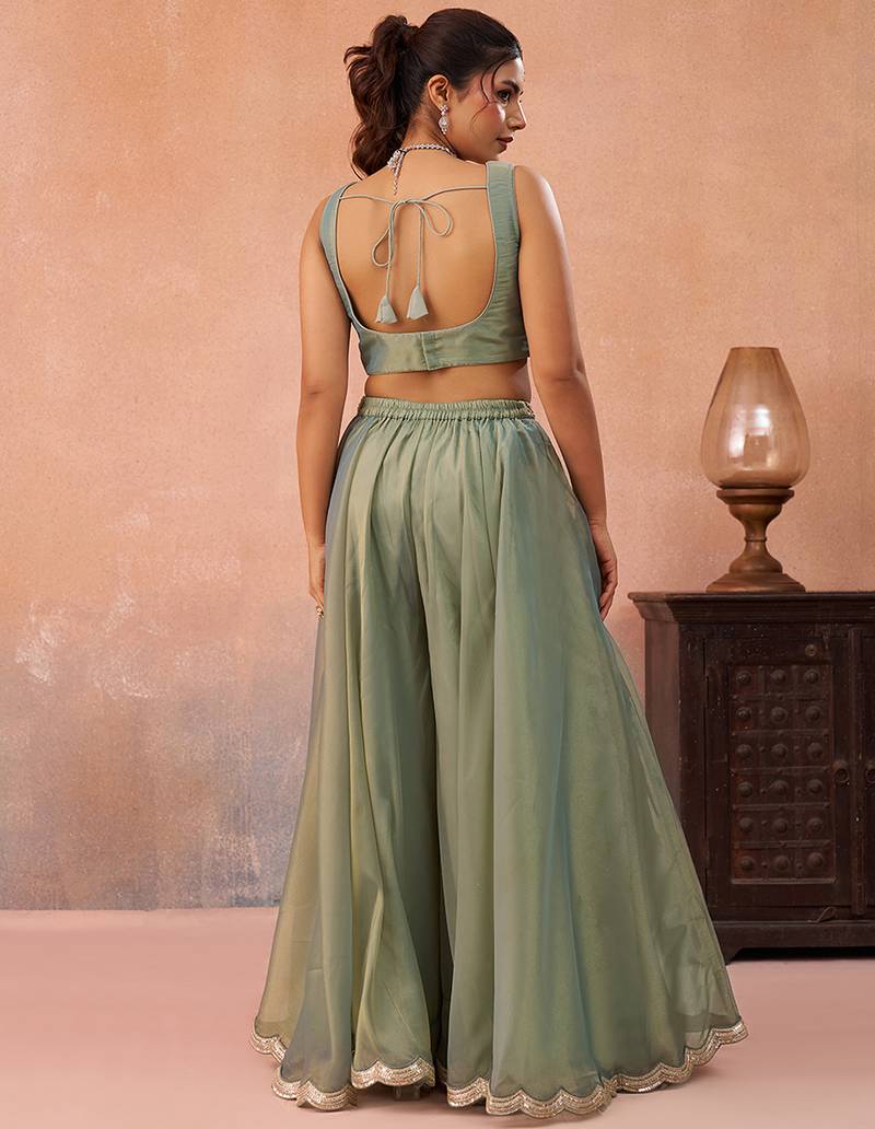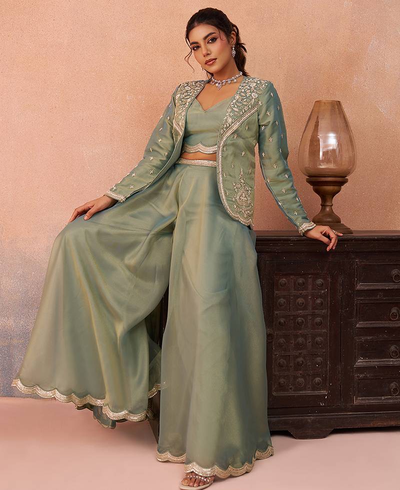 Sage green tissue floral embroidered crop top with jacket & flared palazzo set