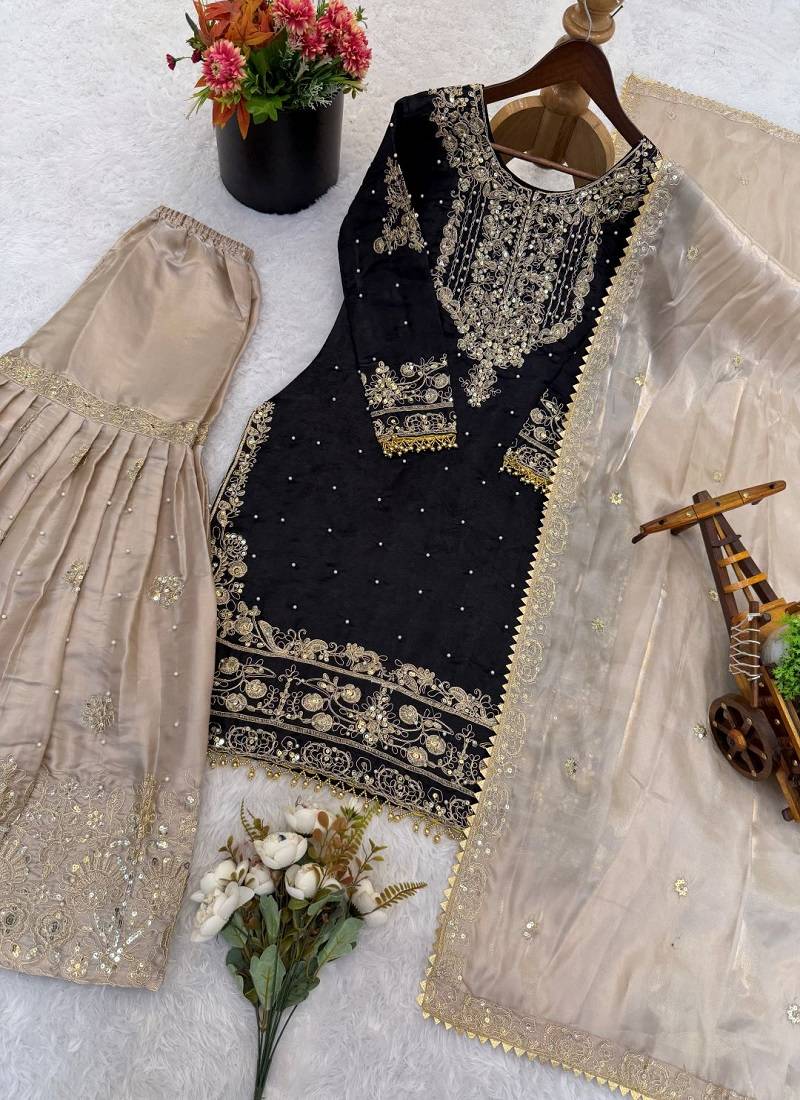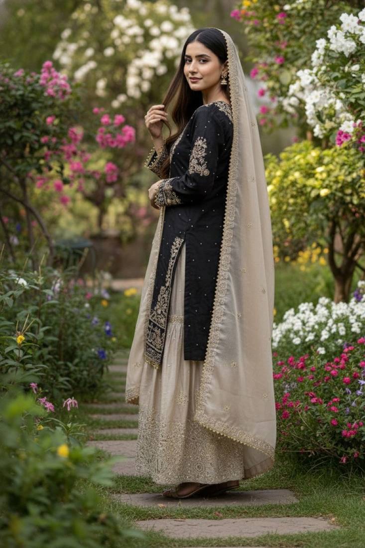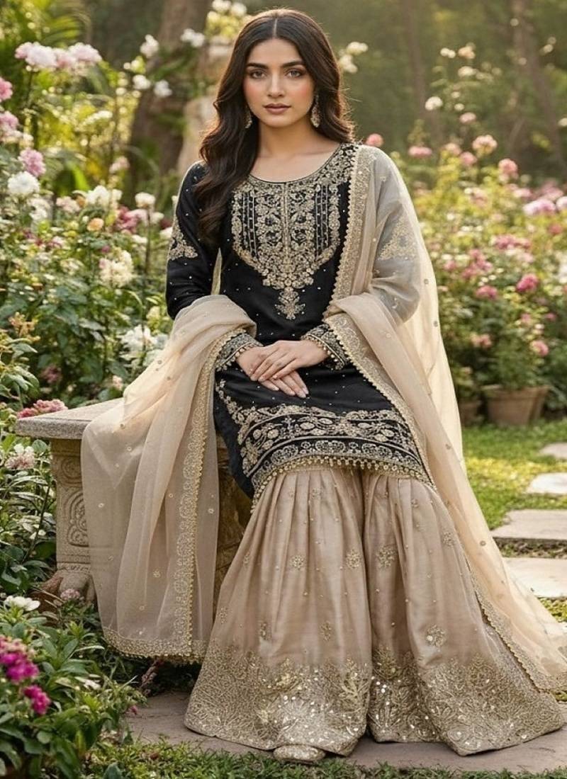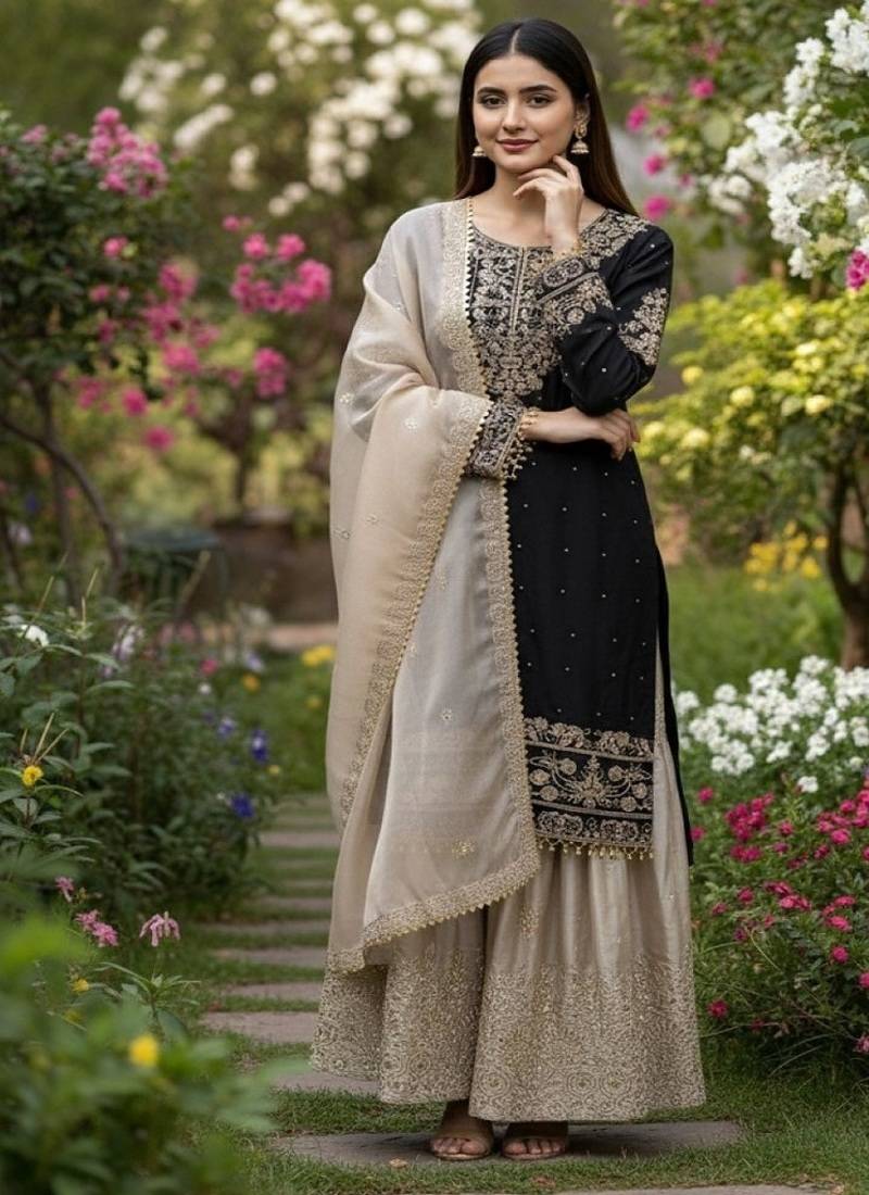 | Product Name | Black Embroidered Kurta Sharara Set With Silk Dupatta Party Wear | |