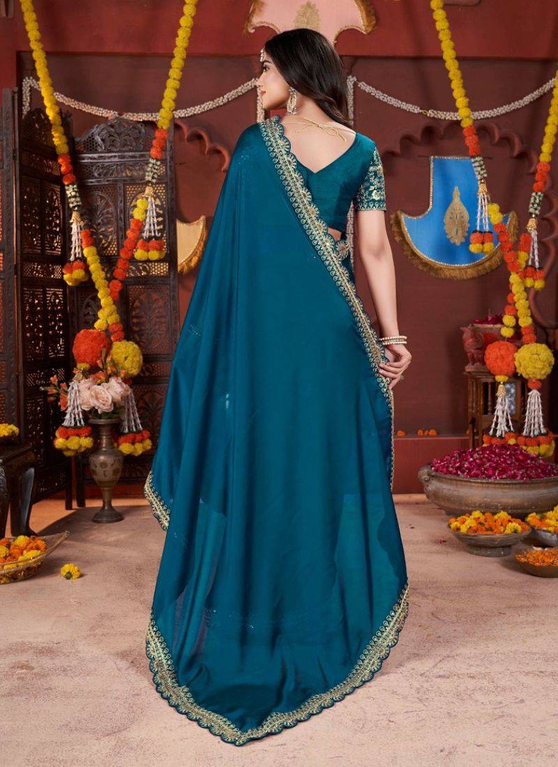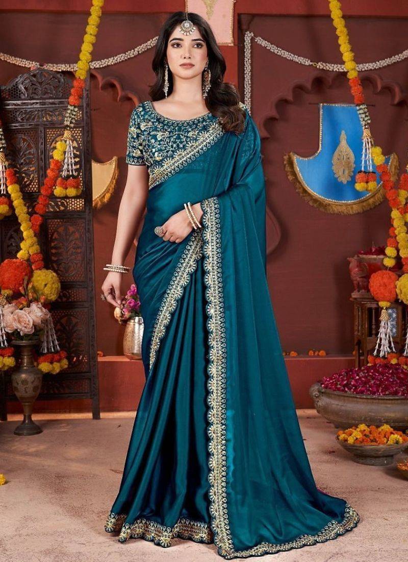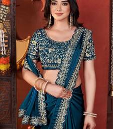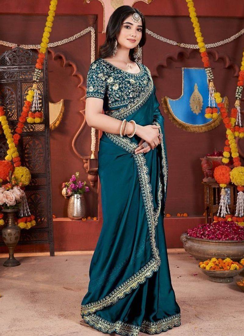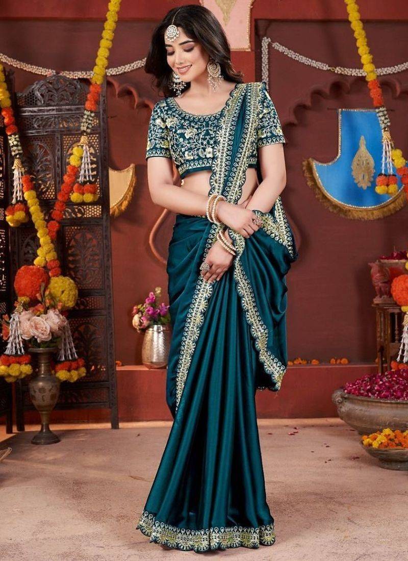 Designer rama green heavy embroidered silk blend party wear saree with blouse