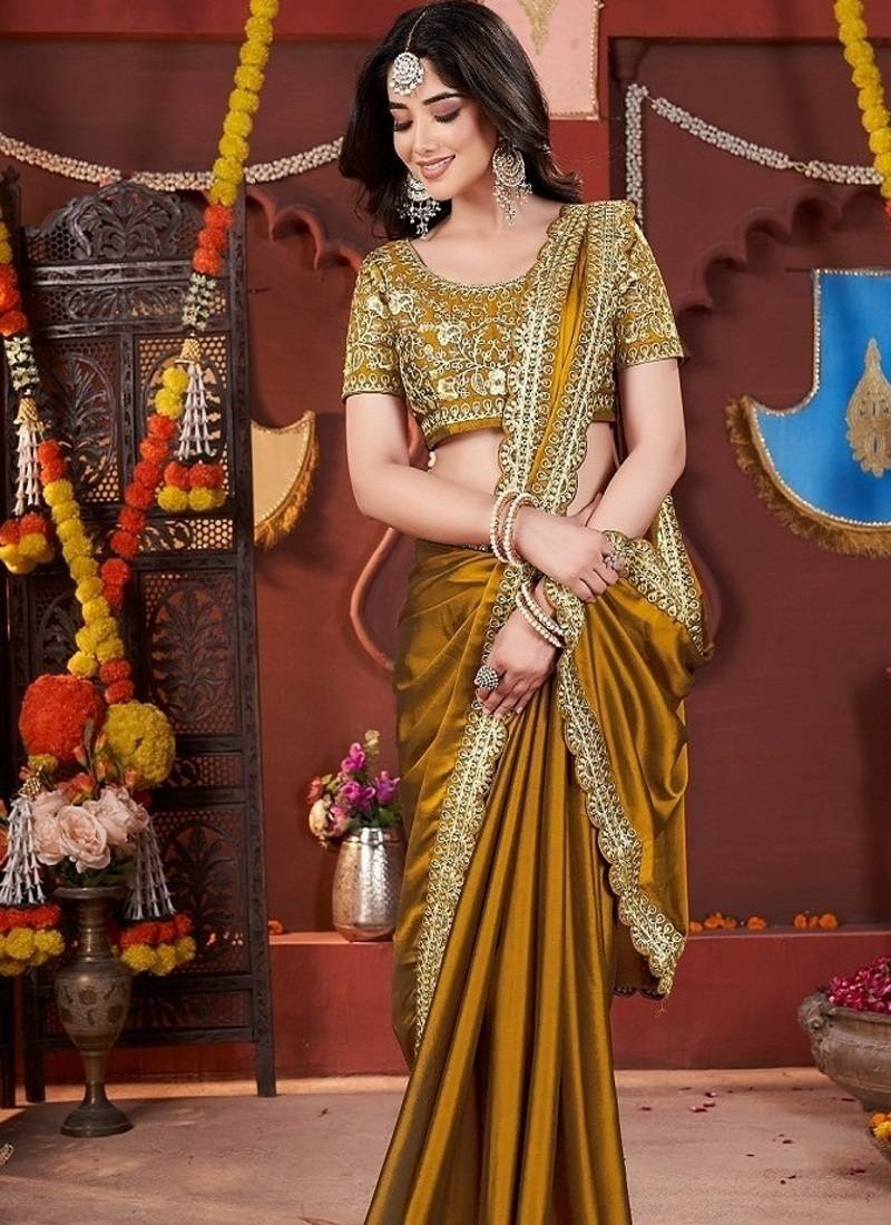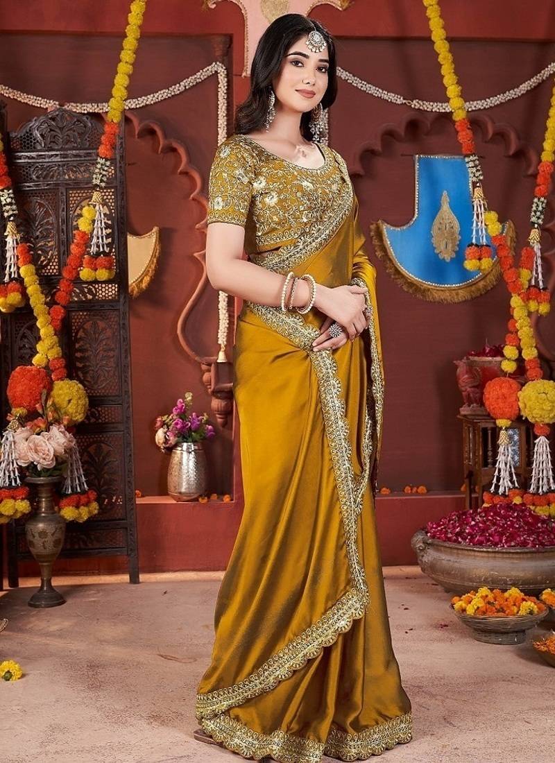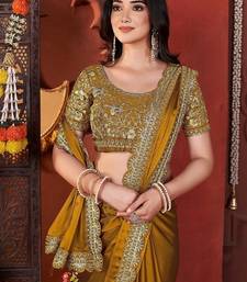 Designer yellow heavy embroidered silk blend party wear saree with blouse