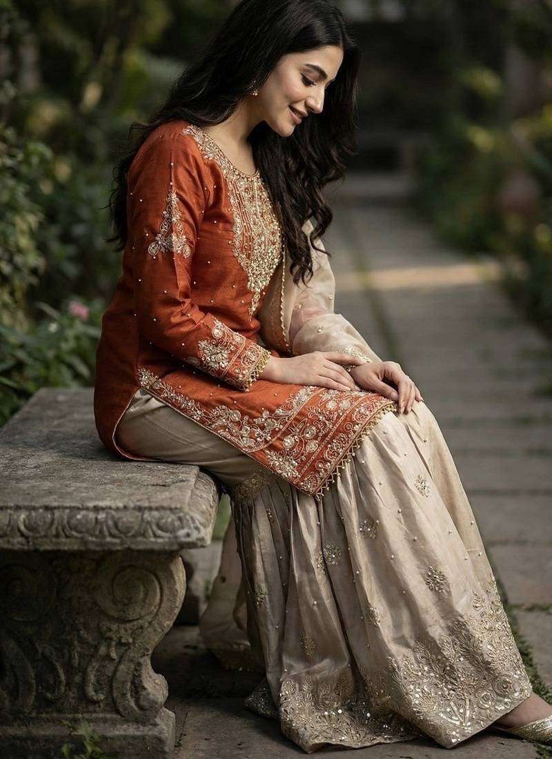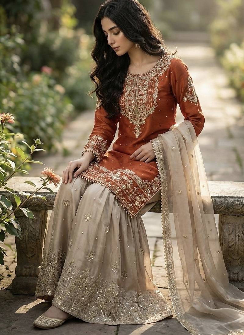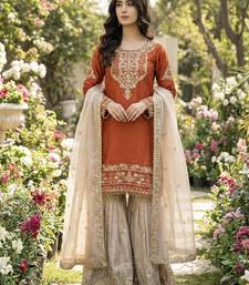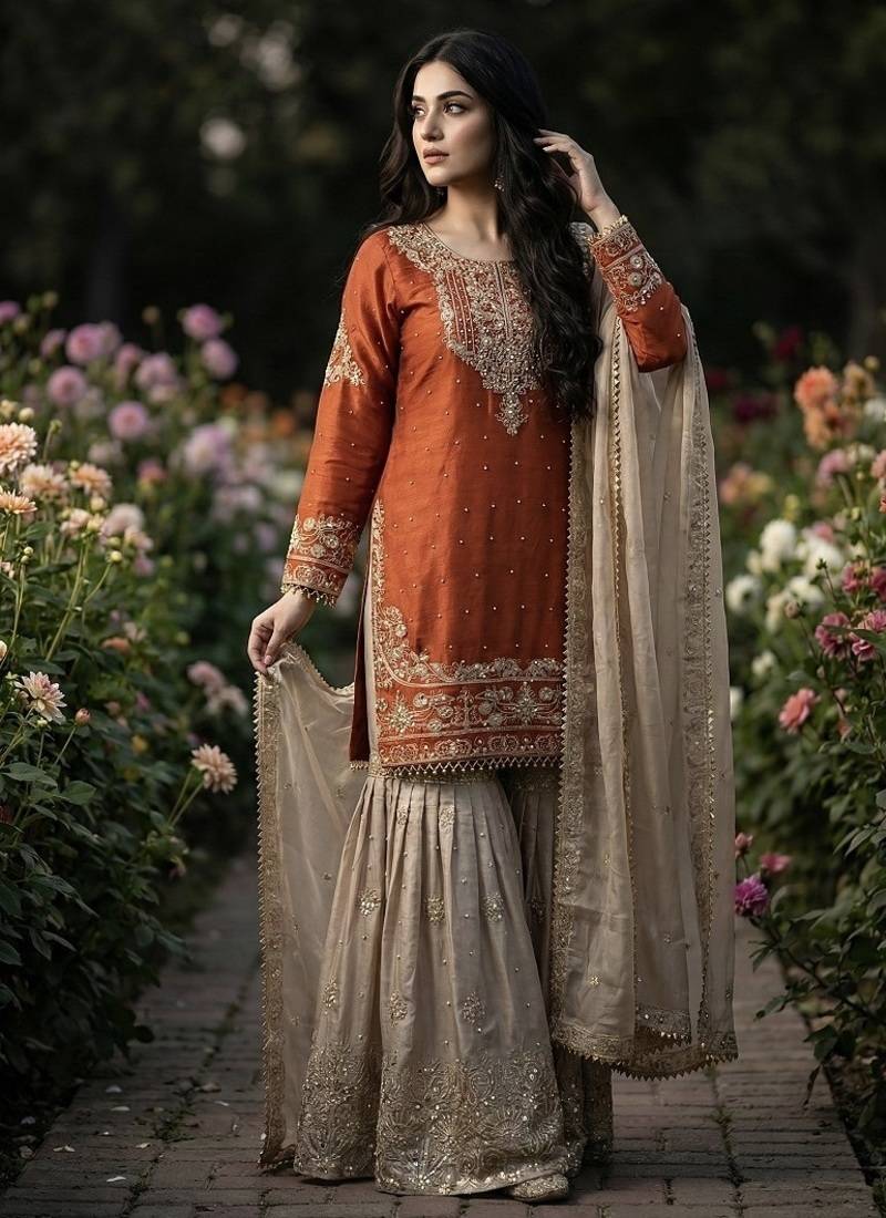 | Product Name | Orange Embroidered Kurta Sharara Set With Silk Dupatta Party Wear | |