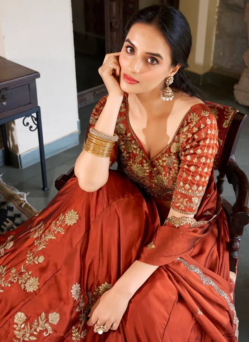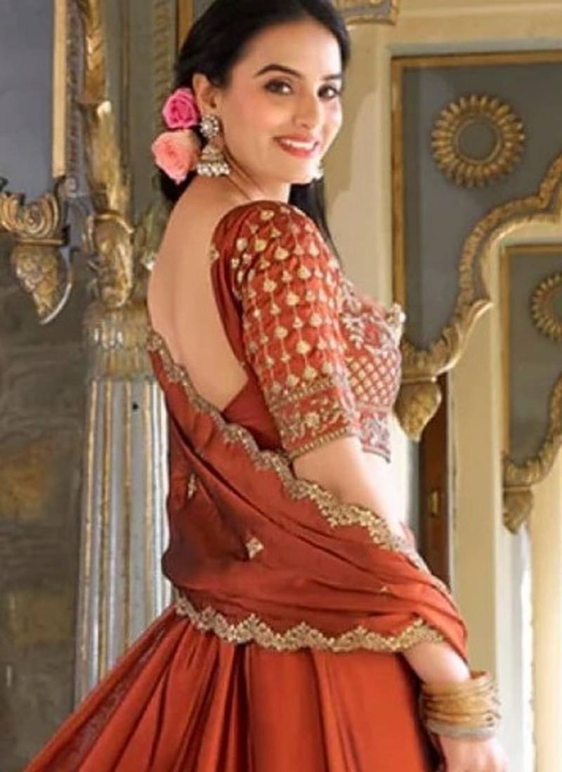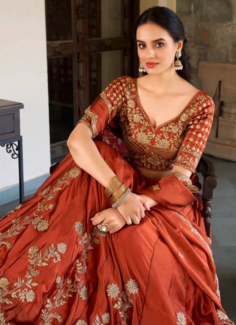 | Product Name | Rust Orange Embroidered Silk Lehenga Choli With Heavy Golden Threadwork & Dupatta | Bridal & Wedding Wear | |