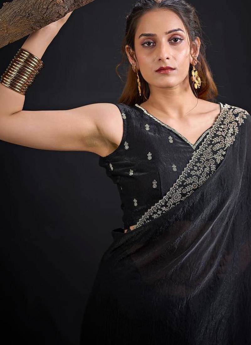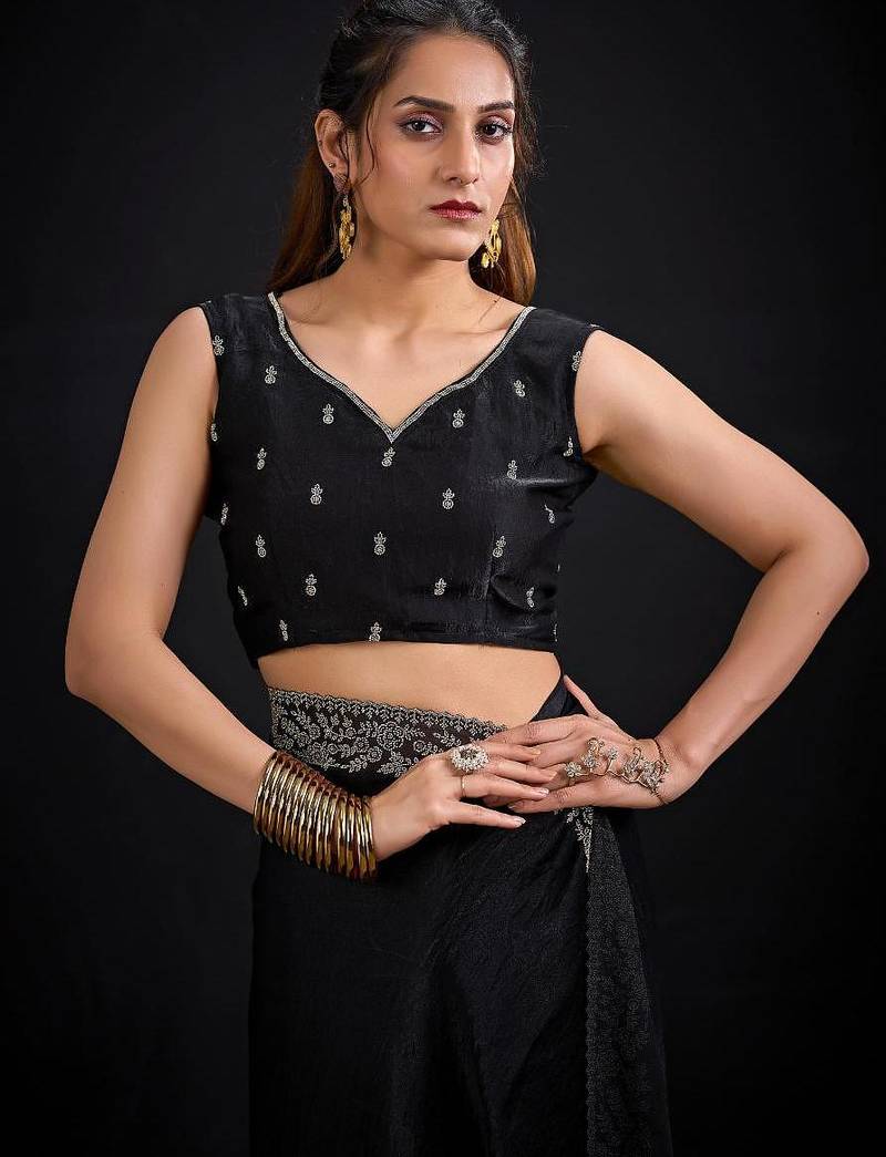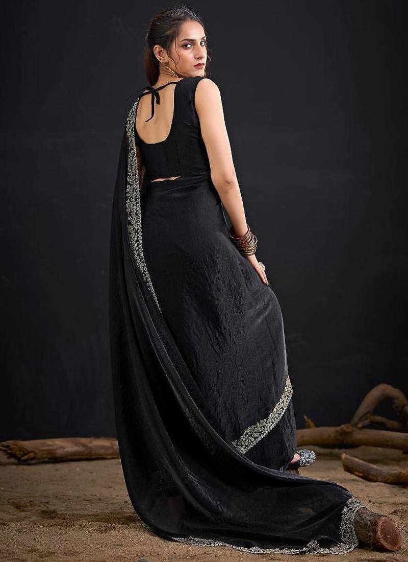 | Product Name | Black Color Fendi Satin Silk Two Tone Handwork Zircon Border Saree | |
