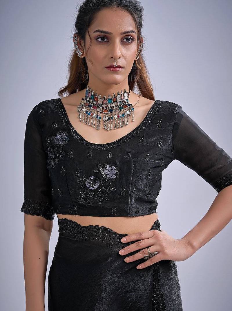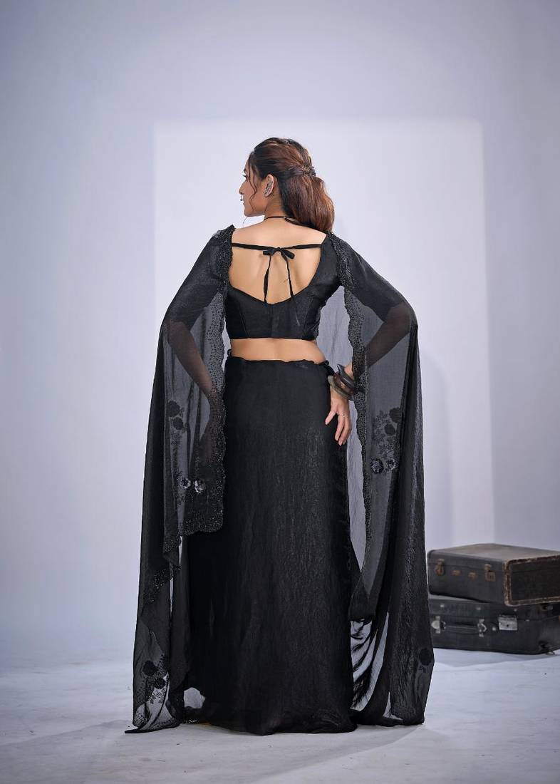 | Product Name | Black Color Fendy Satin Silk Two Tone Zircon Cut Dana & Sequence Hand Work Saree | |