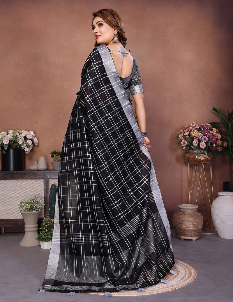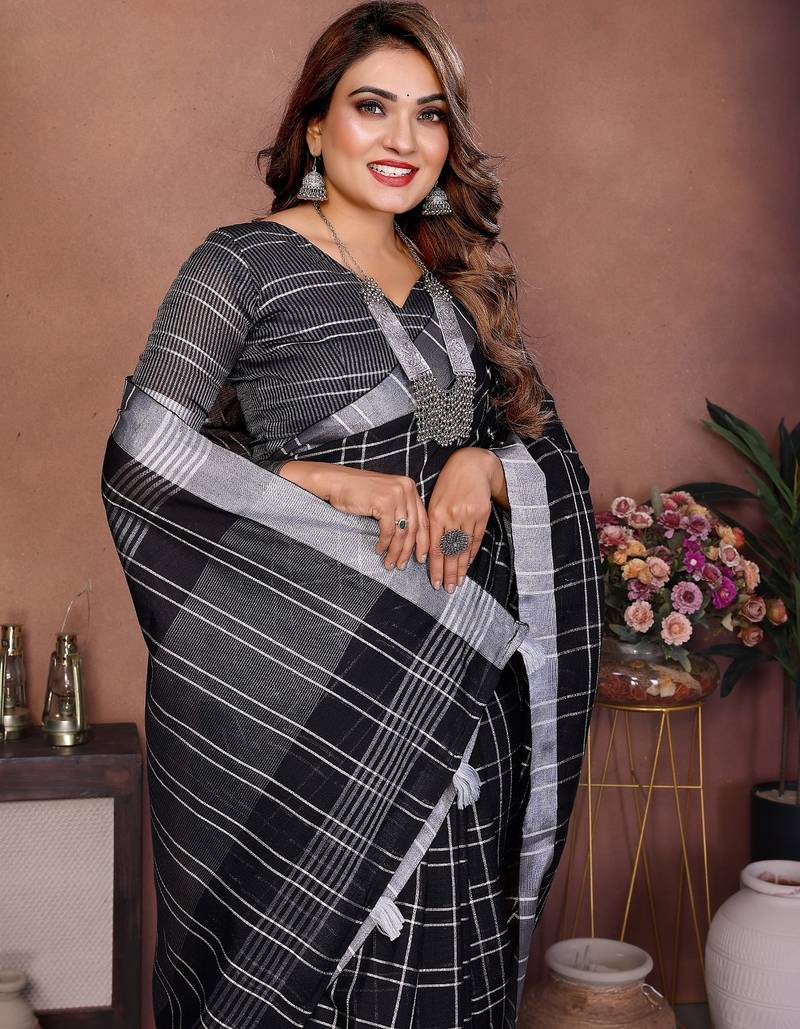 | Product Name | Black Color Linen Cotton Silver Zari Border & Weaving Saree With Un Stitched Blouse | |