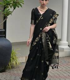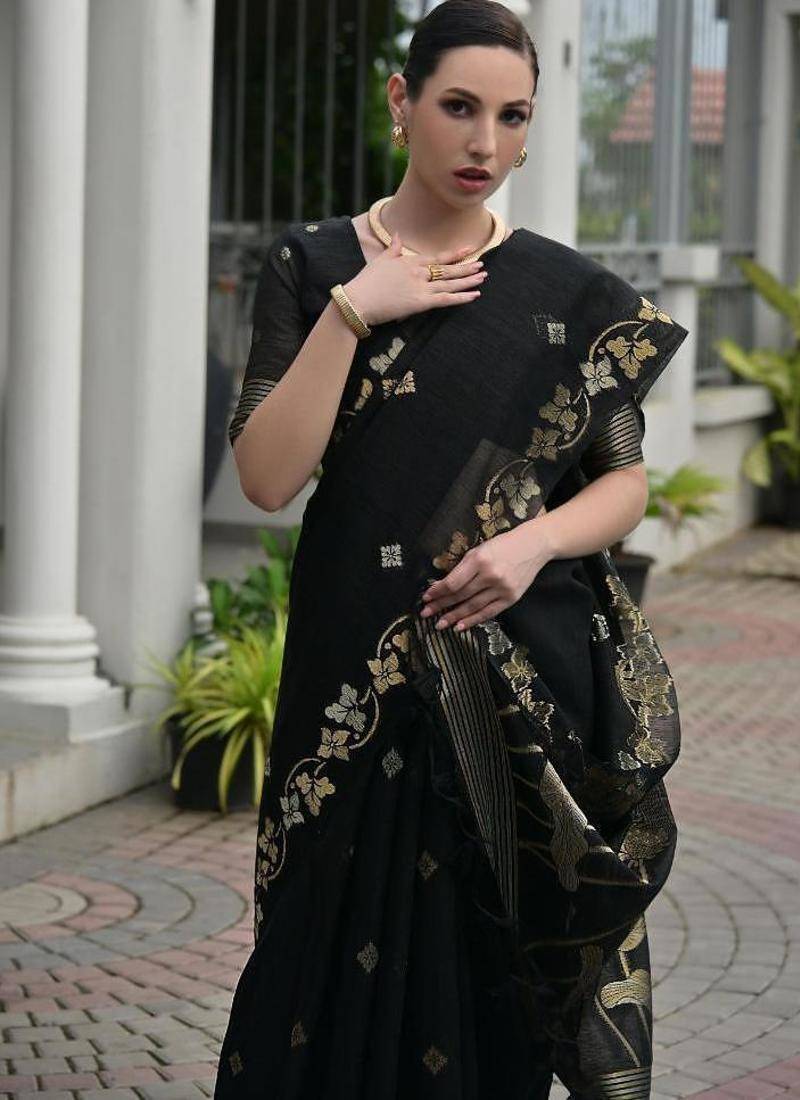 Black color linen jute silk zari weaves saree with blouse