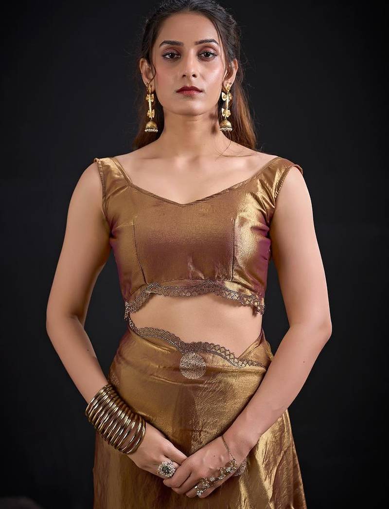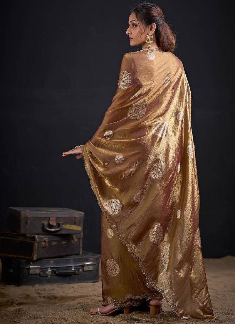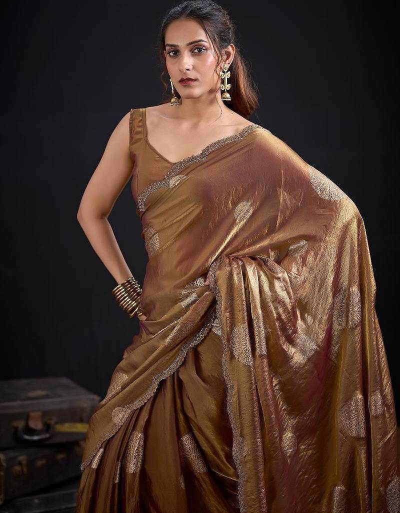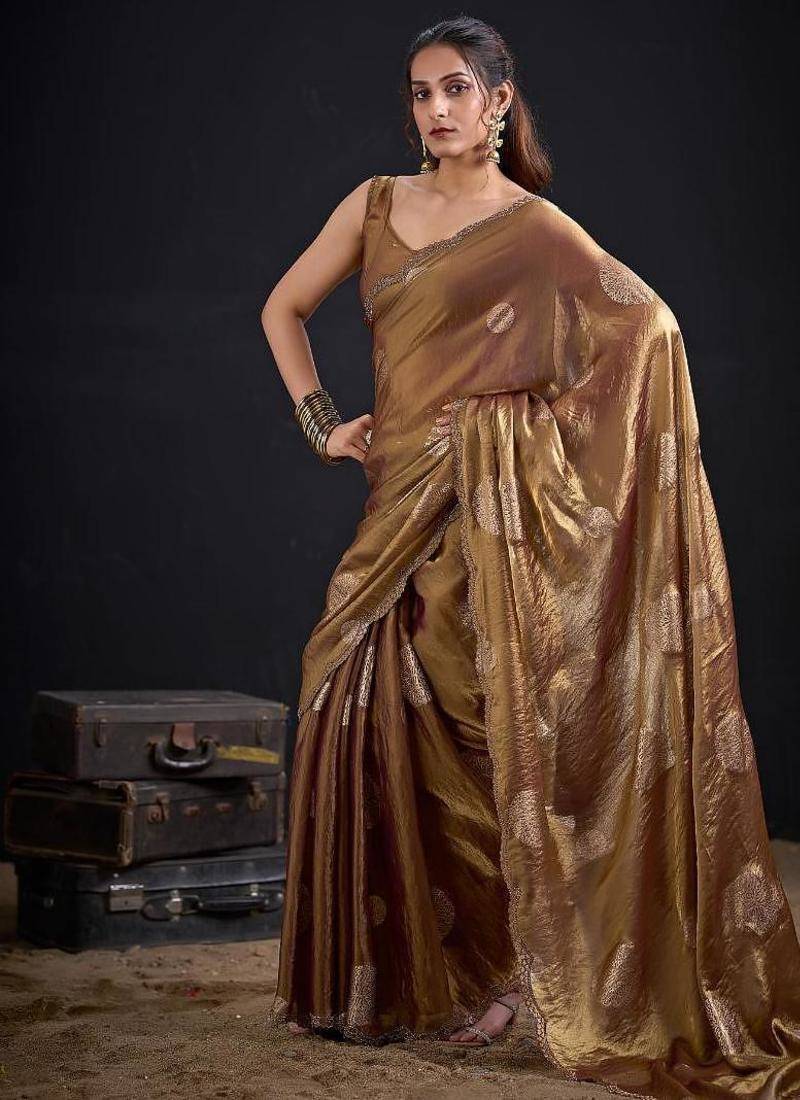 | Product Name | Chiku Color Fendi Silk Two Ton With Foil Handwork Zircon Work Saree | |