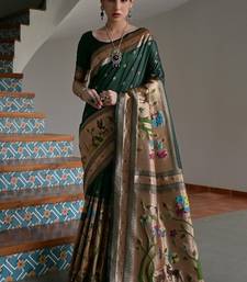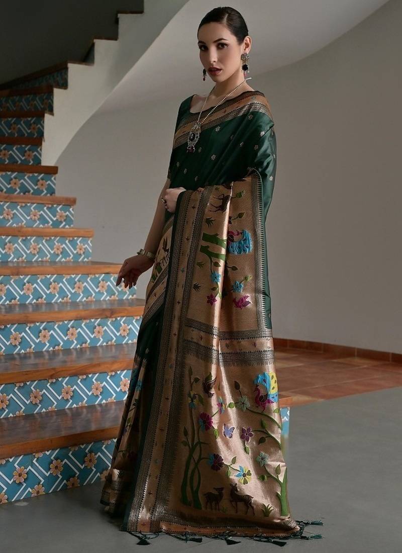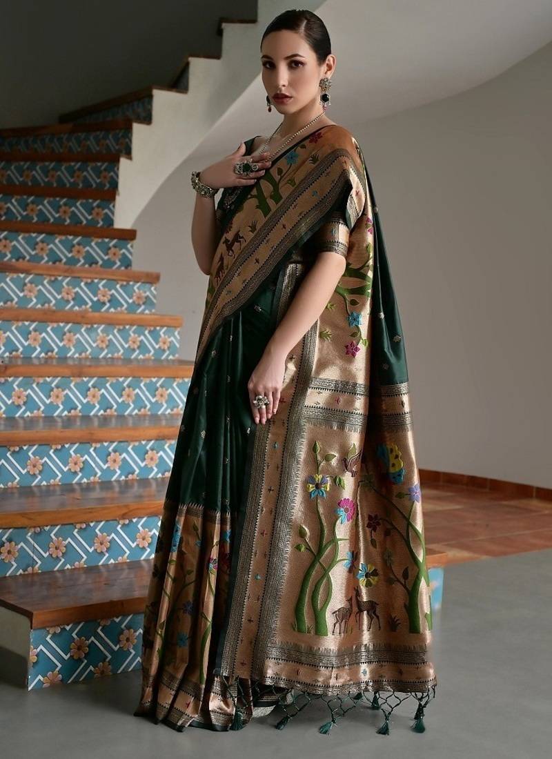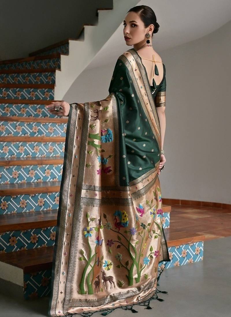 Dark green color banarasi silk paithani zari weaving saree