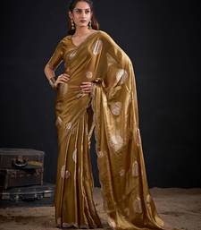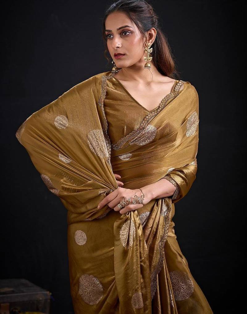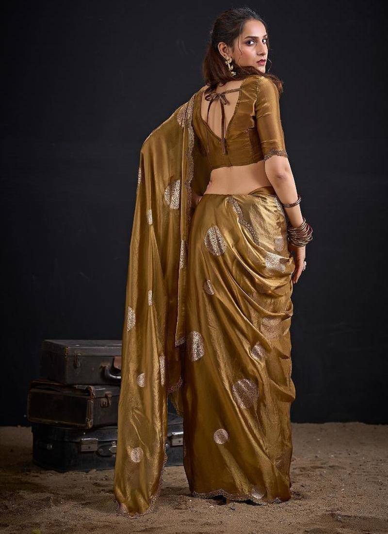 Gold color fendi silk two ton with foil handwork zircon work saree