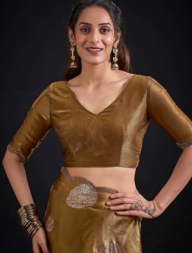 | Product Name | Gold Color Fendi Silk Two Ton With Foil Handwork Zircon Work Saree | |