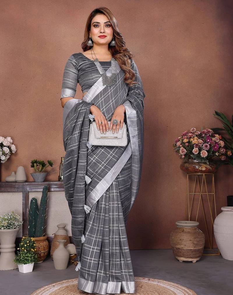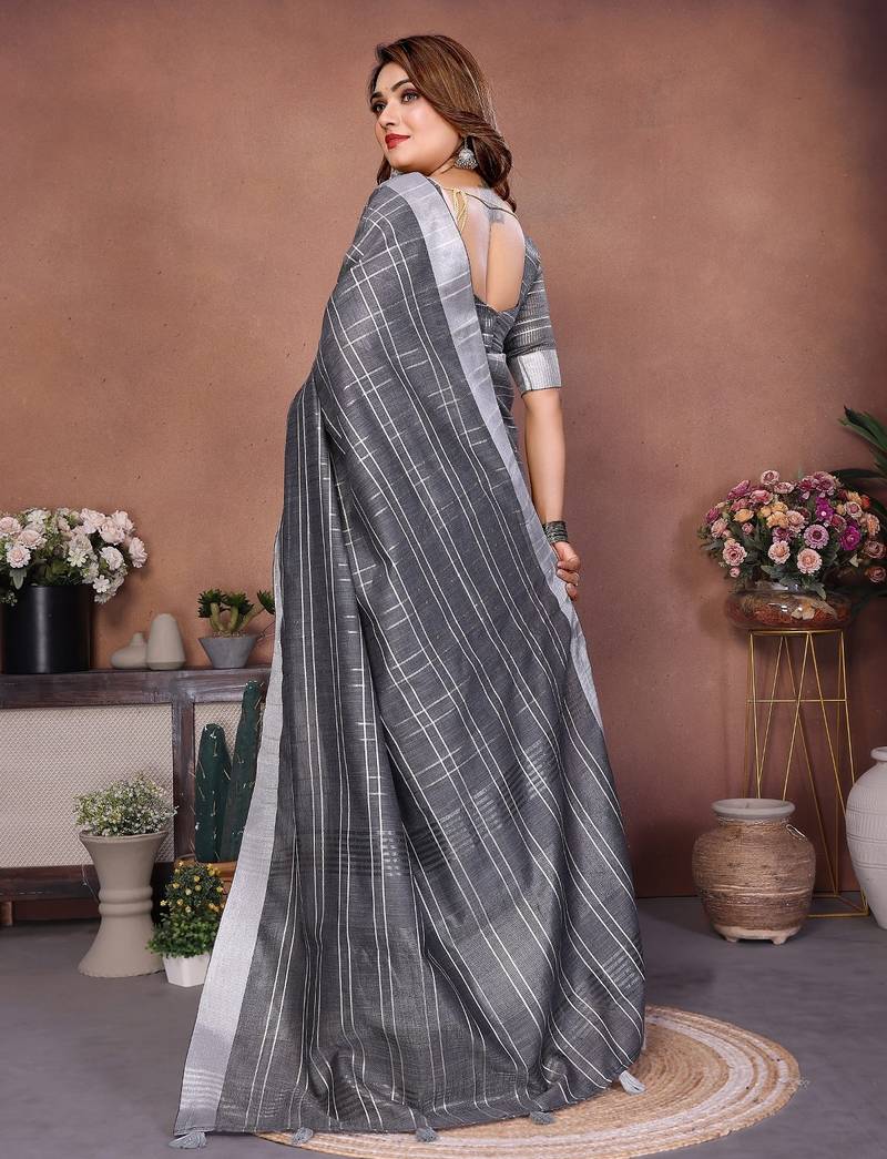| Product Name | Grey Color Linen Cotton Silver Zari Border & Weaving Saree With Un Stitched Blouse | |