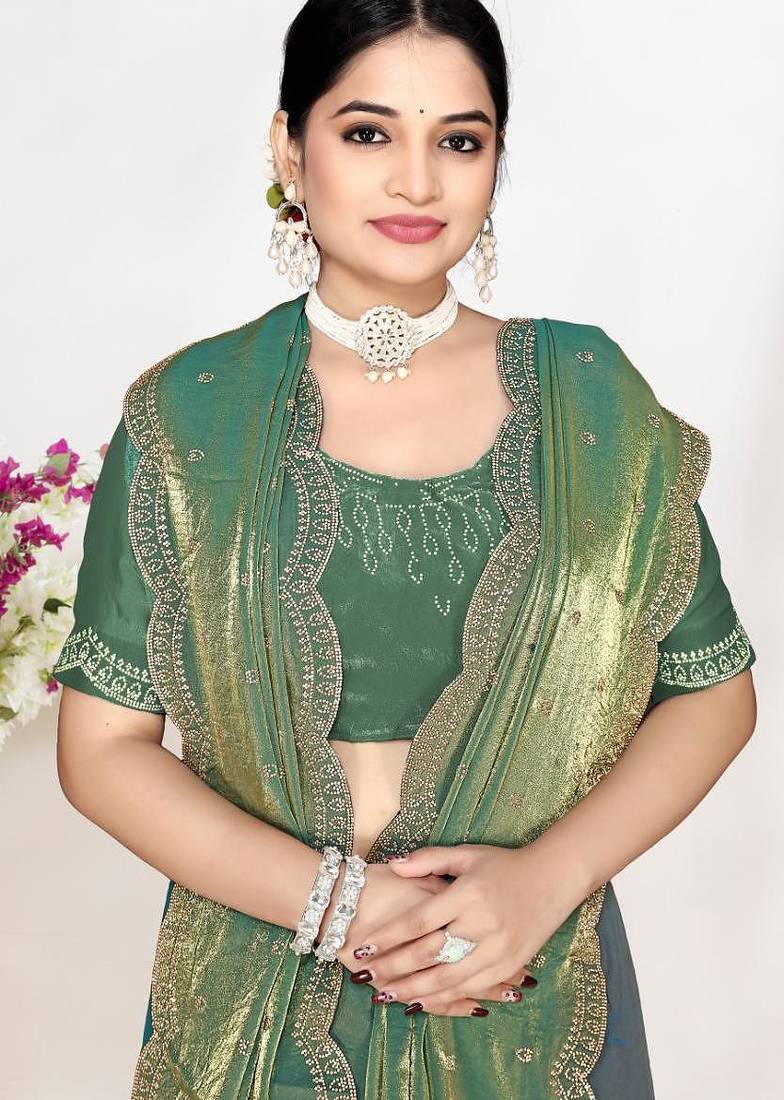 Ice blue color fendi satin silk two tone zircon work saree