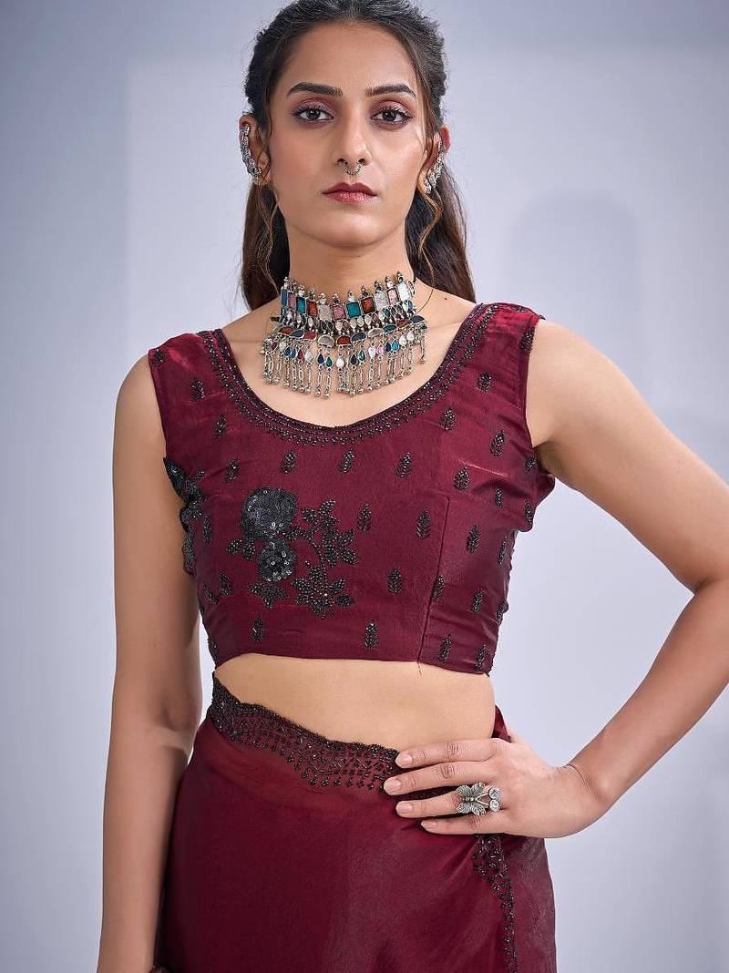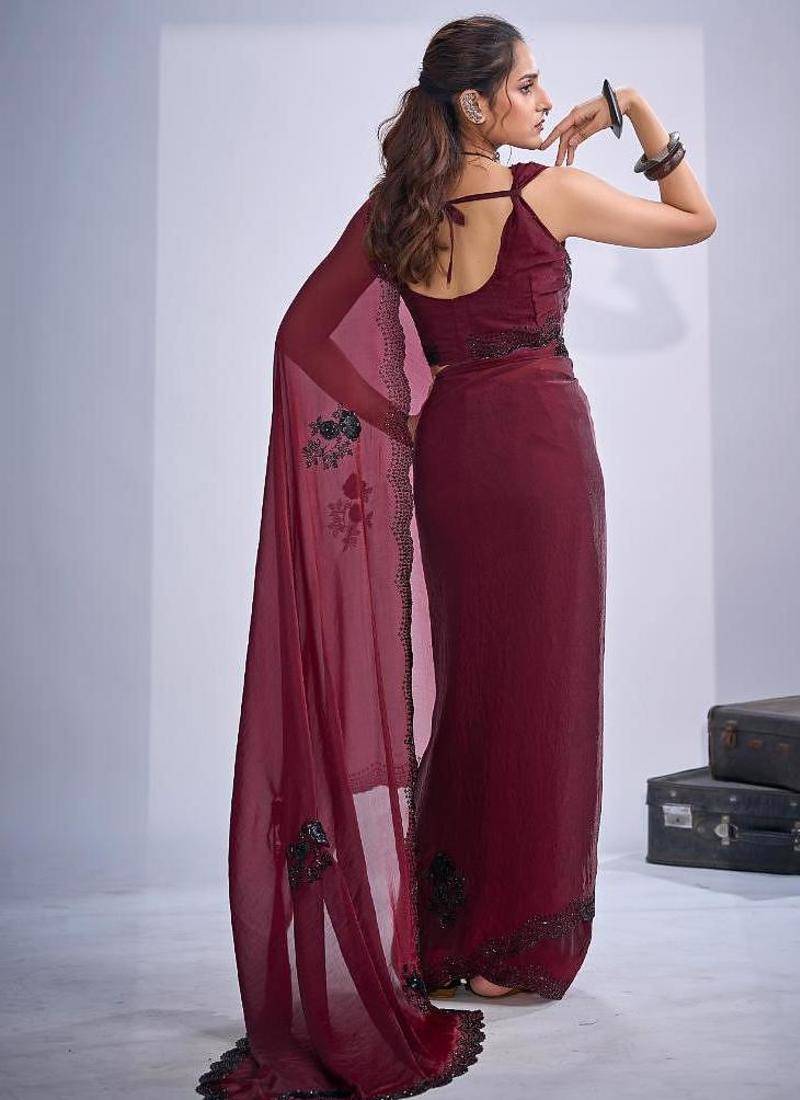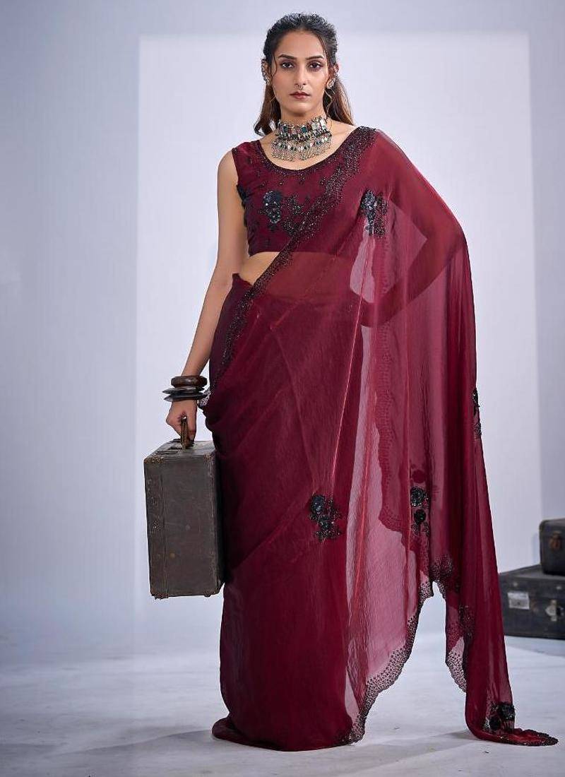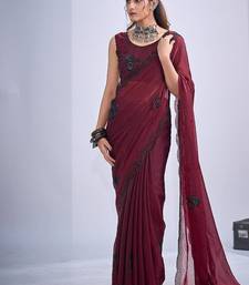 Maroon color fendy satin silk two tone zircon cut dana & sequence hand work saree