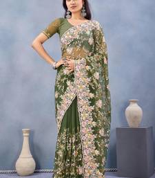 Mehendi green color net resham embroidered & handwork zircon work saree